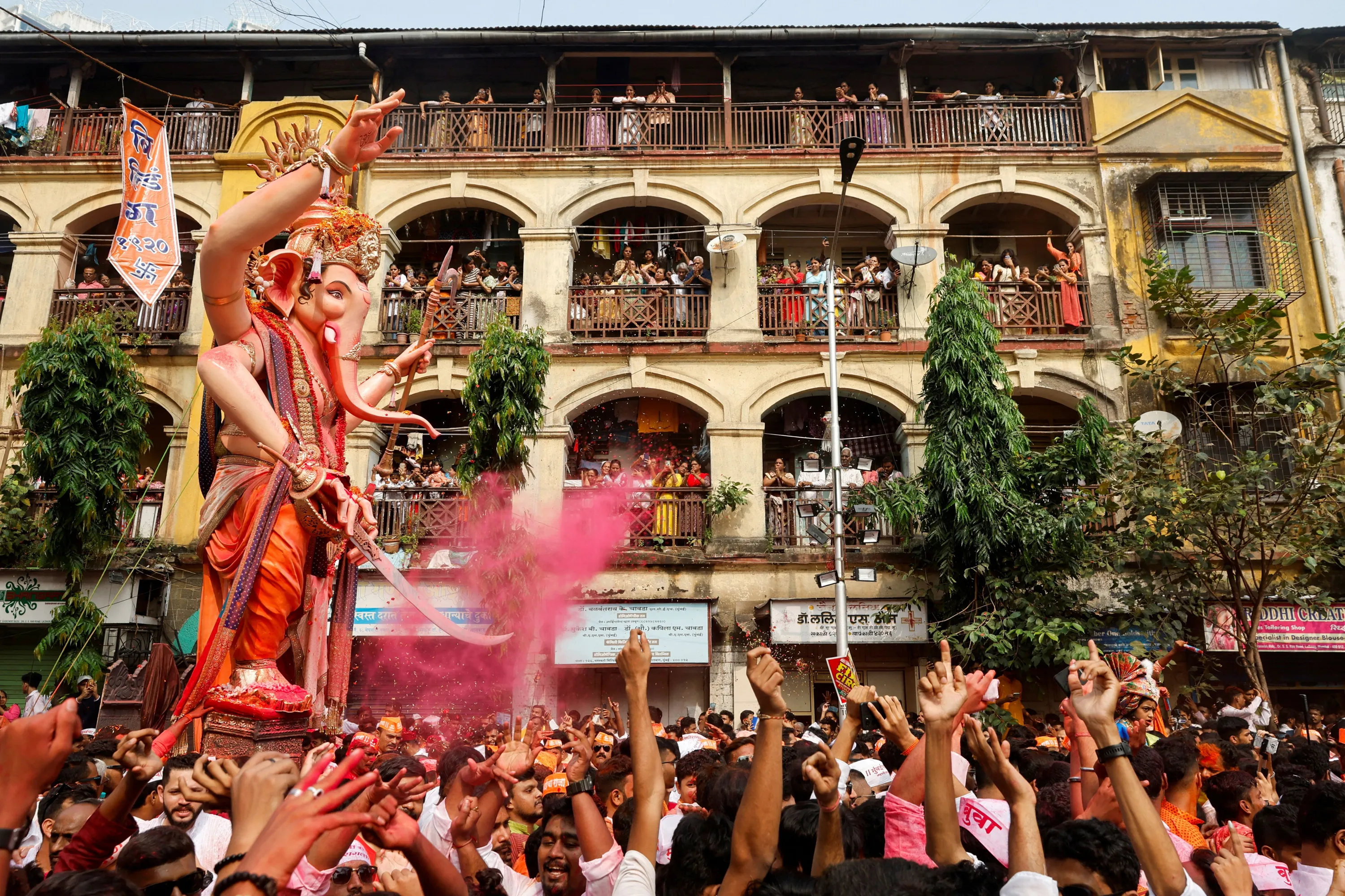 People carry an idol of the Hindu elephant god Ganesh, the deity of prosperity, for immersion into the Arabian Sea on the last day of the Ganesh Chaturthi Festival, in Mumbai, India on September 28, 2023. (Photo by Francis Mascarenhas/Reuters)