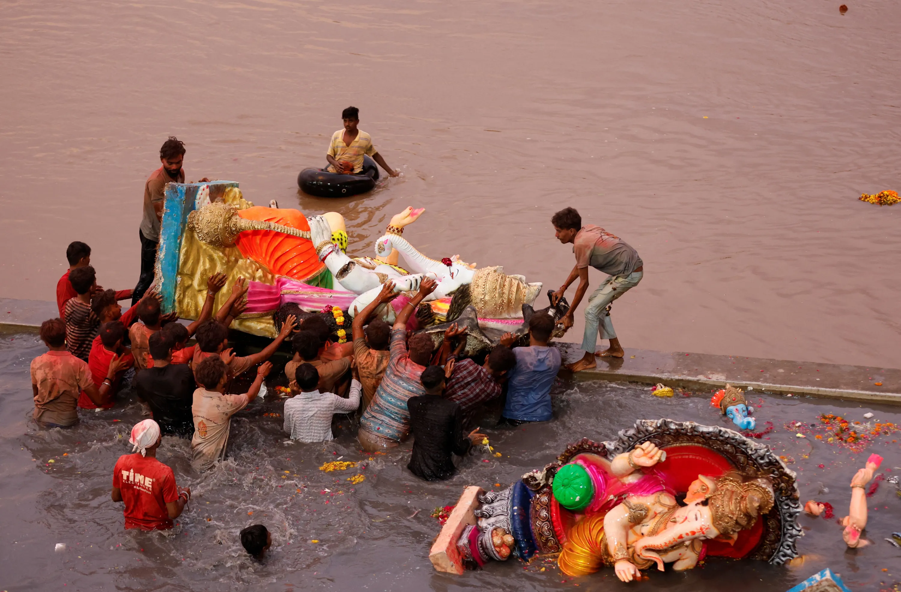 Devotees shift an idol of the Hindu god Ganesh, the deity of prosperity, from an artificial pond to the Sabarmati river after being immersed on the last day of the Ganesh Chaturthi Festival, in Ahmedabad, India on September 28, 2023. (Photo by Amit Dave/Reuters)