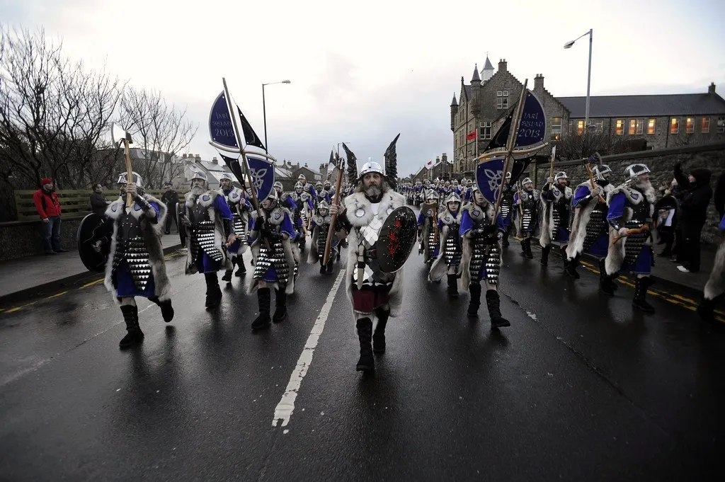 Participants dressed as Vikings march past during the annual Up Helly Aa festival in Lerwick, Shetland Islands on January 29, 2013. Up Helly Aa celebrates the influence of the Scandinavian Vikings in the Shetland Islands and culminates with up to 1,000 'guizers' (men in costume) throwing flaming torches into their Viking longboat and setting it alight later in the evening. AFP PHOTO / ANDY BUCHANAN (Photo credit should read Andy Buchanan/AFP/Getty Images)