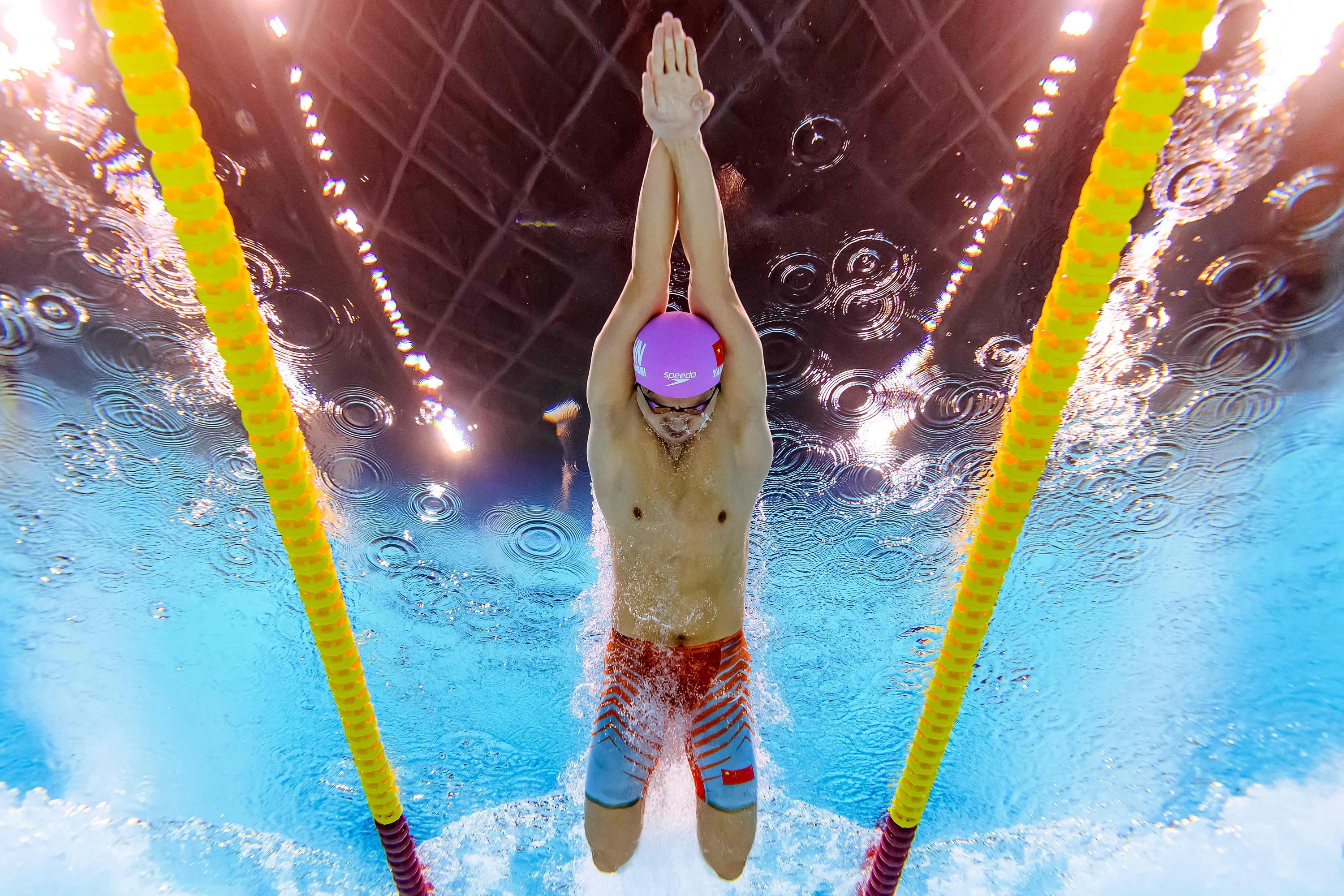 China's Yan Zibei competes in the heats of the men's 100m breaststroke event during the 2022 Asian Games in Hangzhou in China's eastern Zhejiang province on September 25, 2023. (Photo by Manan Vatsyayana/AFP Photo)
