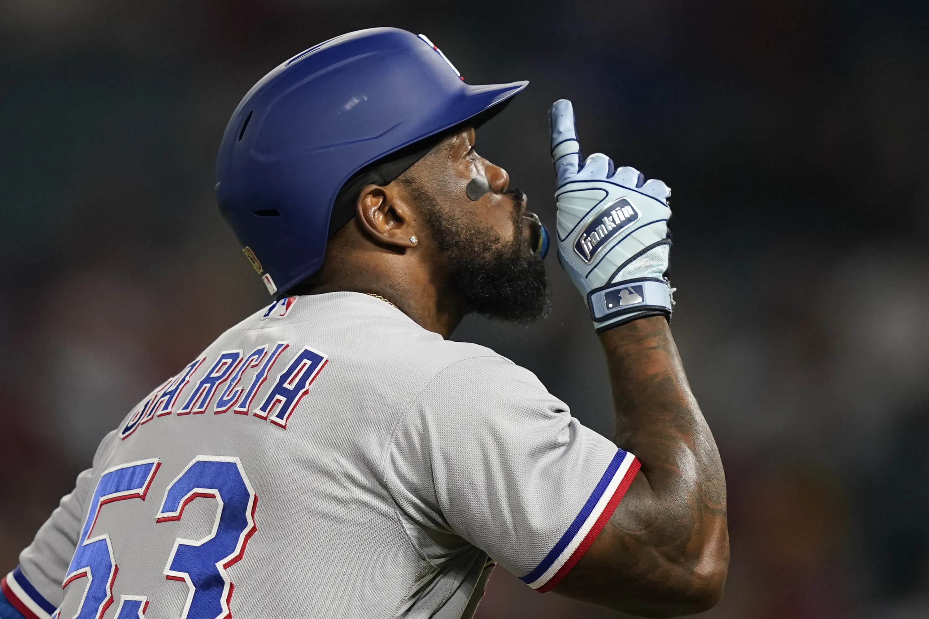 Texas Rangers' Adolis Garcia celebrates while running the bases after hitting a home run during the sixth inning of a baseball game against the Los Angeles Angels, Monday, September 25, 2023, in Anaheim, Calif. (Photo by Ryan S. Sun/AP Photo)