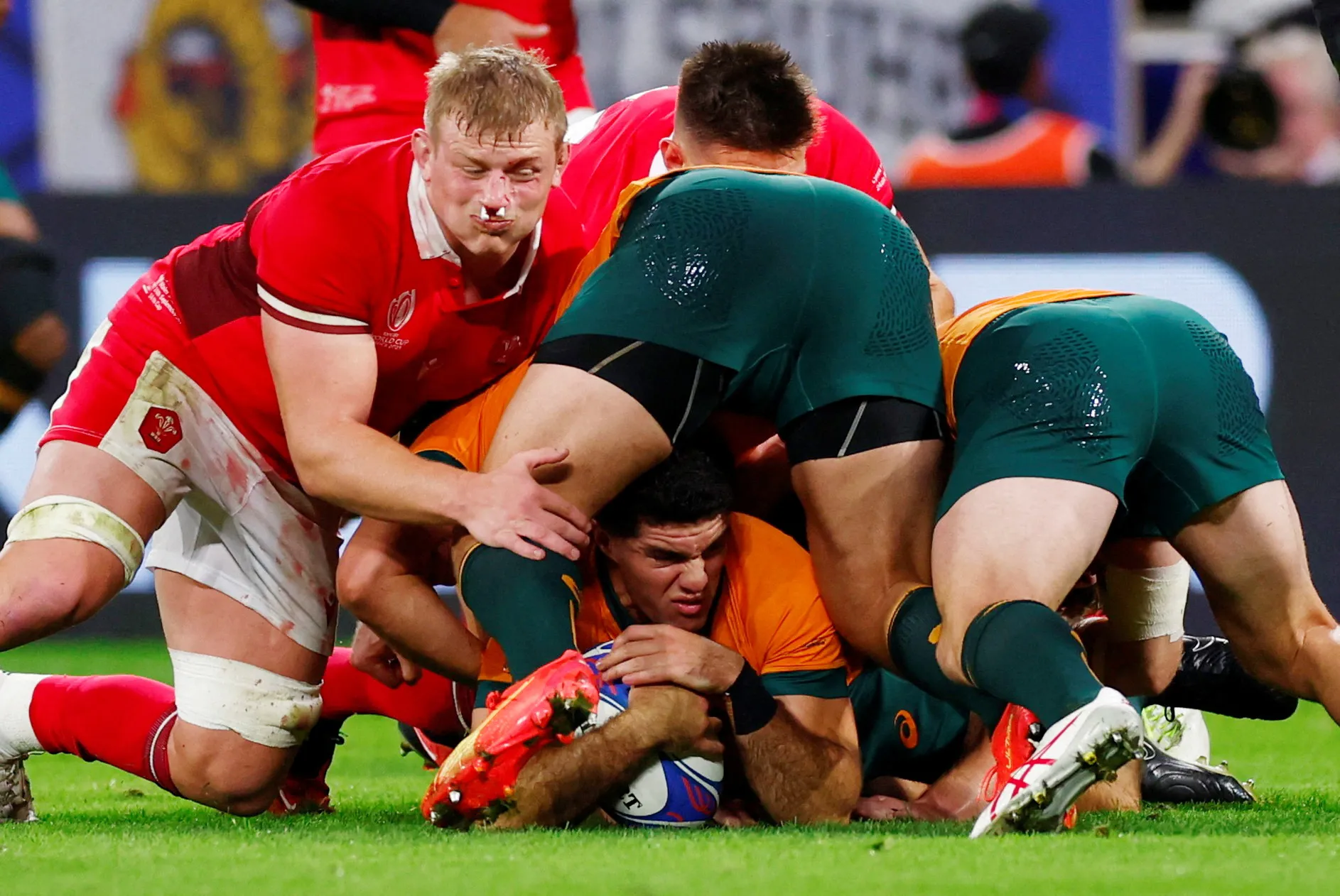 Australia's Ben Donaldson in action with Wales' Jac Morgan during the Rugby World Cup 2023 in Lyon, France on September 24, 2023. (Photo by Gonzalo Fuentes/Reuters)