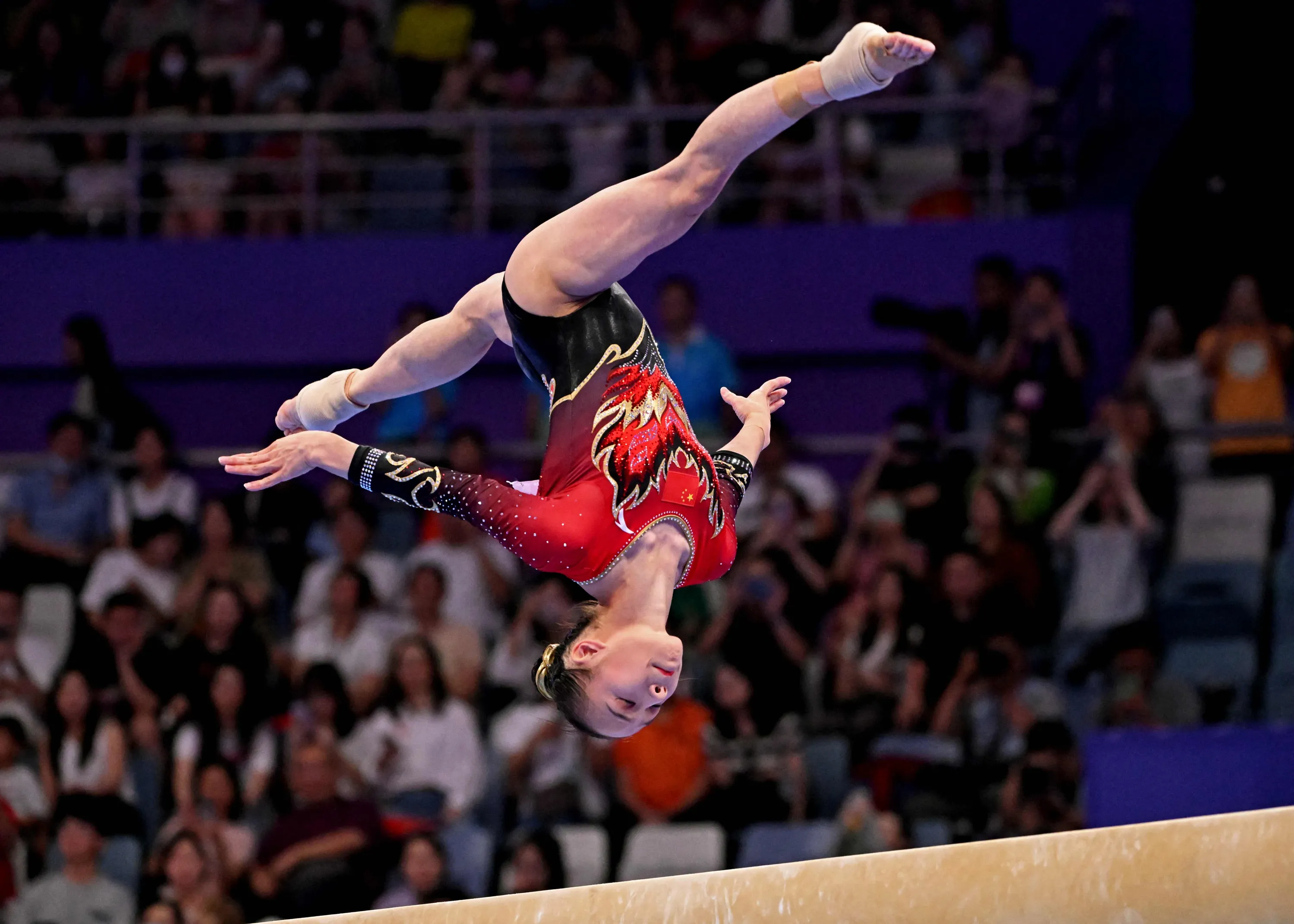 China's Zhang Jin competes on the beam in the artistic gymnastics women's team final at the Hangzhou 2022 Asian Games in Hangzhou in China's eastern Zhejiang province on September 25, 2023. (Photo by William West/AFP Photo)