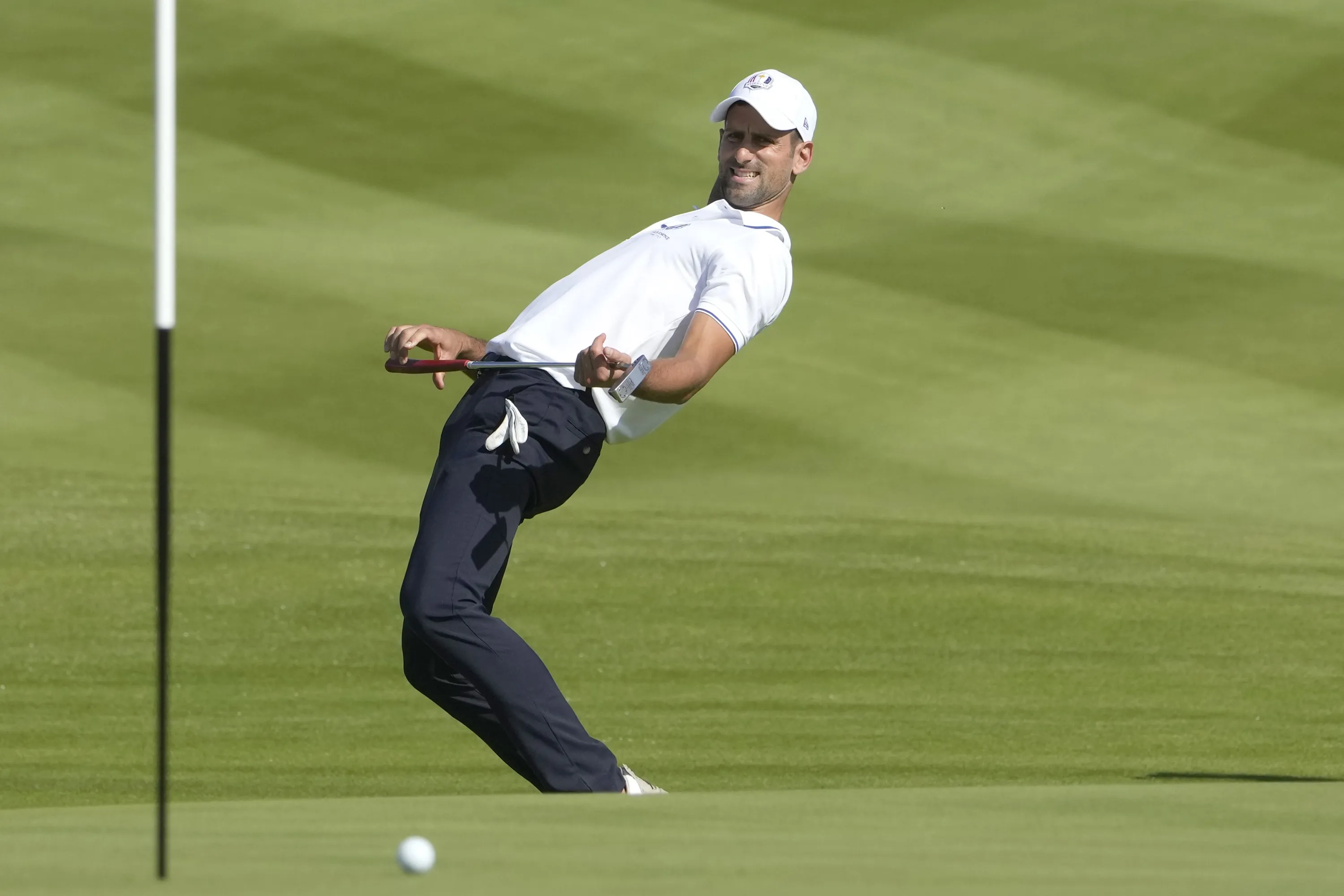 Tennis player Novak Djokovic reacts to his putt on the 18th green during an all stars golf match between Team Colin Montgomerie and Team Corey Pavin at the Marco Simone Golf Club in Guidonia Montecelio, Italy, Wednesday, September 27, 2023. The Ryder Cup starts Sept. 29, at the Marco Simone Golf Club. (Photo by Andrew Medichini/AP Photo)