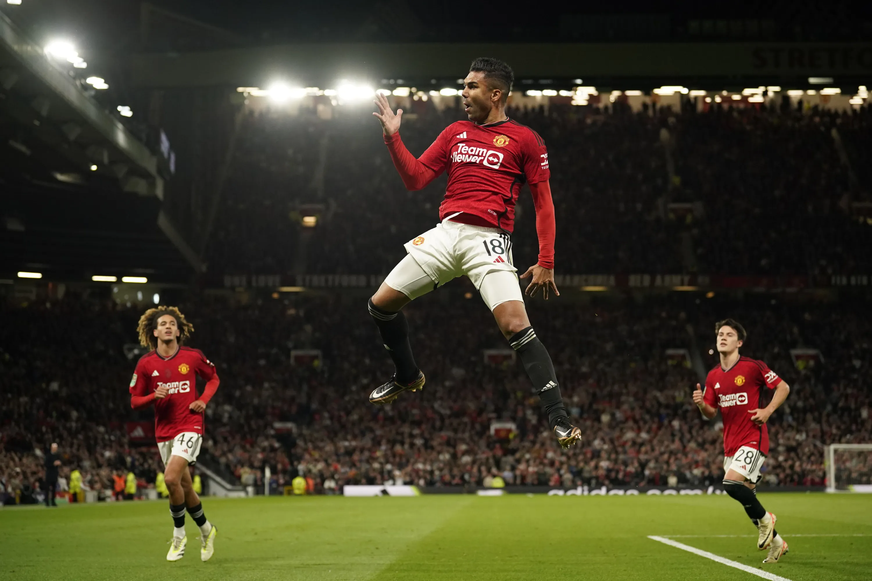 Manchester United's Casemiro celebrates after scoring his side's second goal during the English League Cup third round soccer match between Manchester United and Crystal Palace at Old Trafford stadium in Manchester, England, Tuesday, September 26, 2023. (Photo by Dave Thompson/AP Photo)