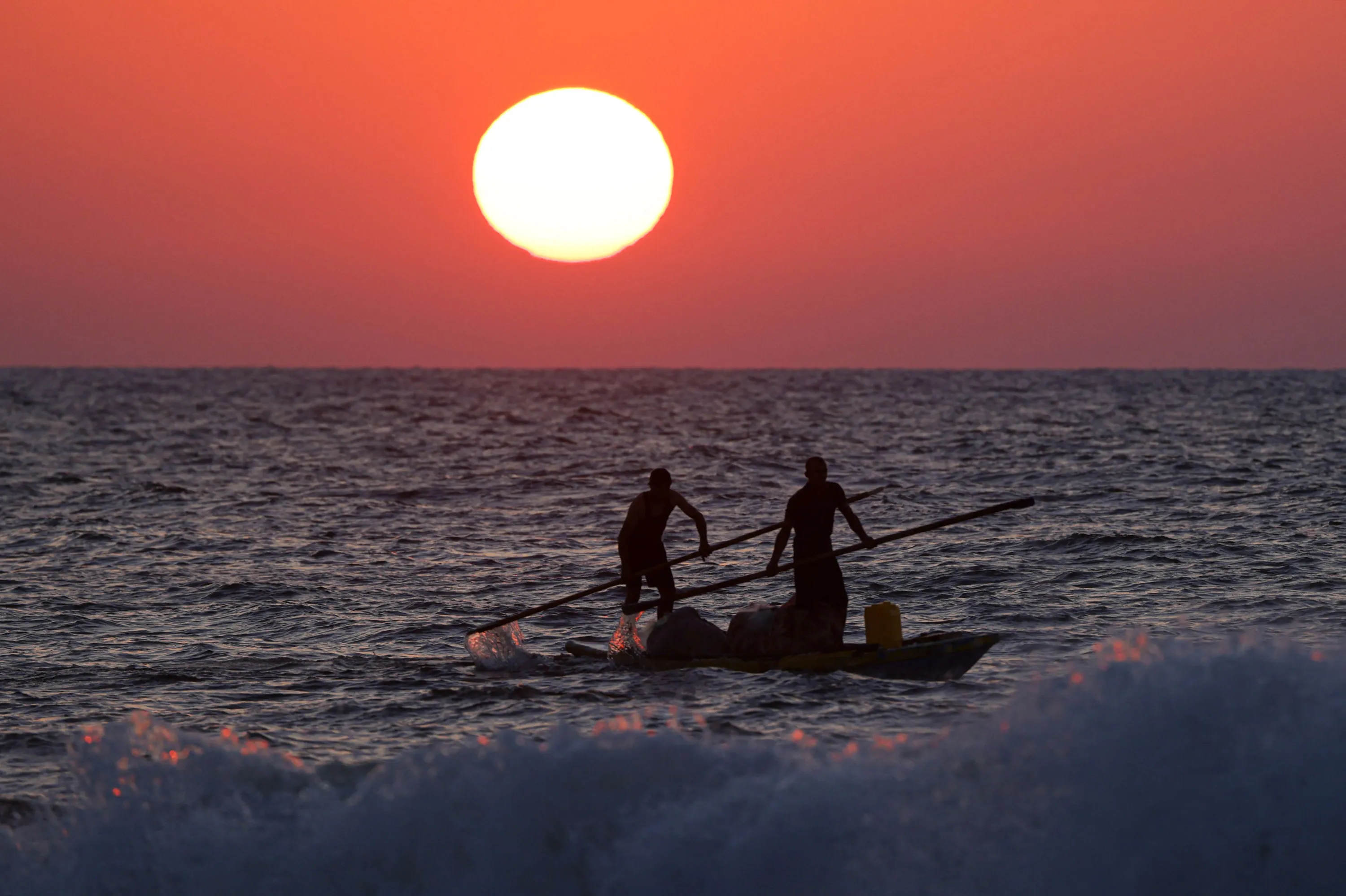 Palestinian fishermen return to the coastline in their kayaks during sunset in Gaza City, on September 5, 2023. (Photo by Mahmud Hams/AFP Photo)