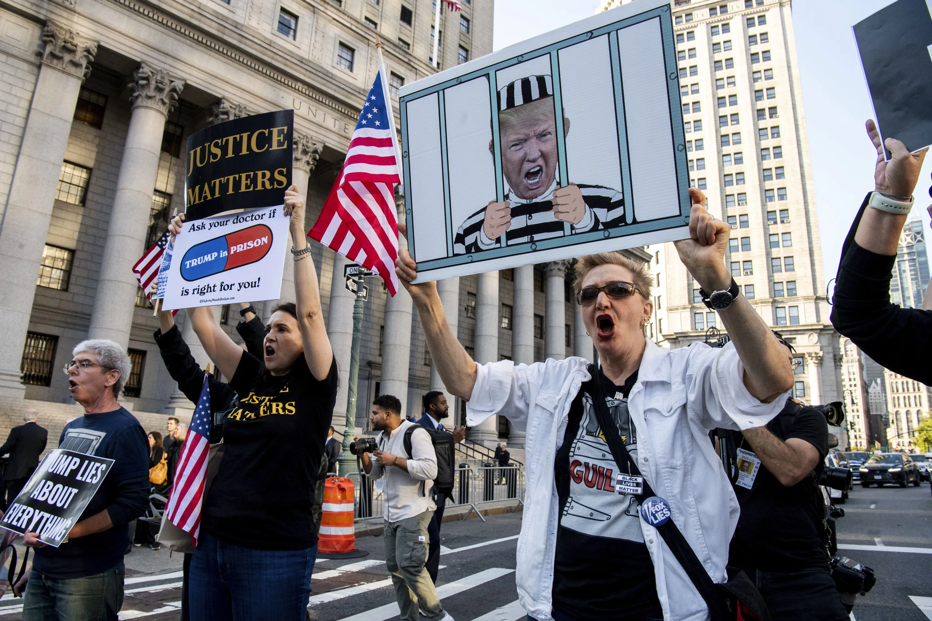 Protesters chant outside the New York Supreme Court ahead of former President Donald Trump's civil business fraud trial on Monday, October 2, 2023 in New York. (Photo by Brittainy Newman/AP Photo)