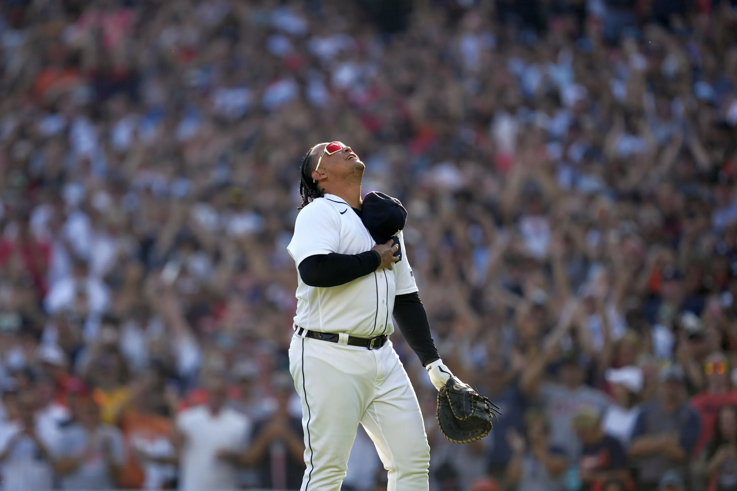Detroit Tigers first baseman Miguel Cabrera reacts against the Cleveland Guardians in the eighth inning of a baseball game, Sunday, October 1, 2023, in Detroit. Cabrera was pulled after making an unassisted fielding out and will retire after the game. (Photo by Paul Sancya/AP Photo)