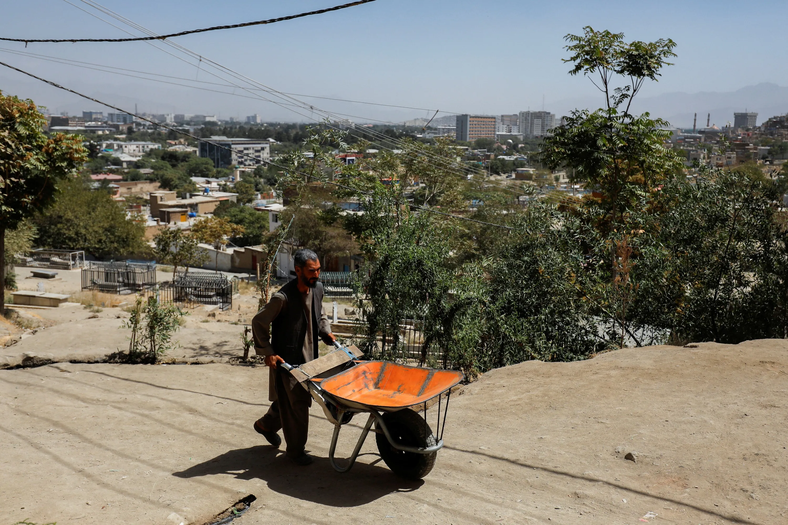 Baba Karim pushes his wheelbarrow in a street in Kabul, Afghanistan on September 3, 2023. (Photo by Ali Khara/Reuters)