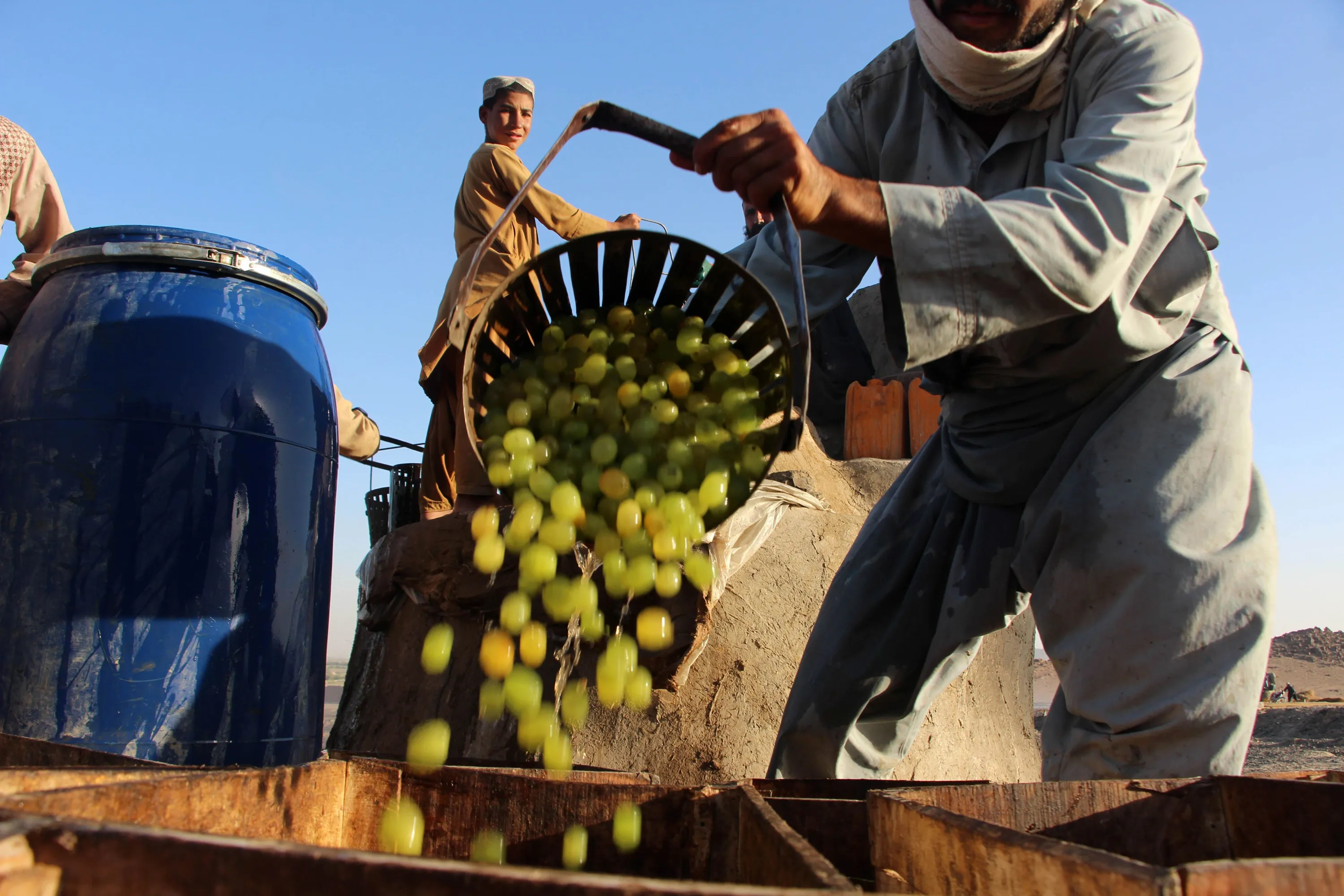 Afghan workers prepare grapes for raisins production in Kandahar, Afghanistan, 11 September 2023. Deputy Director of Kandahar Chamber of Commerce Abdul Baqi Bina said 10,000 tons of raisins worth 32 million US dollars were exported from Kandahar to Pakistan, India and UAE last year. (Photo by EPA/EFE/Stringer)