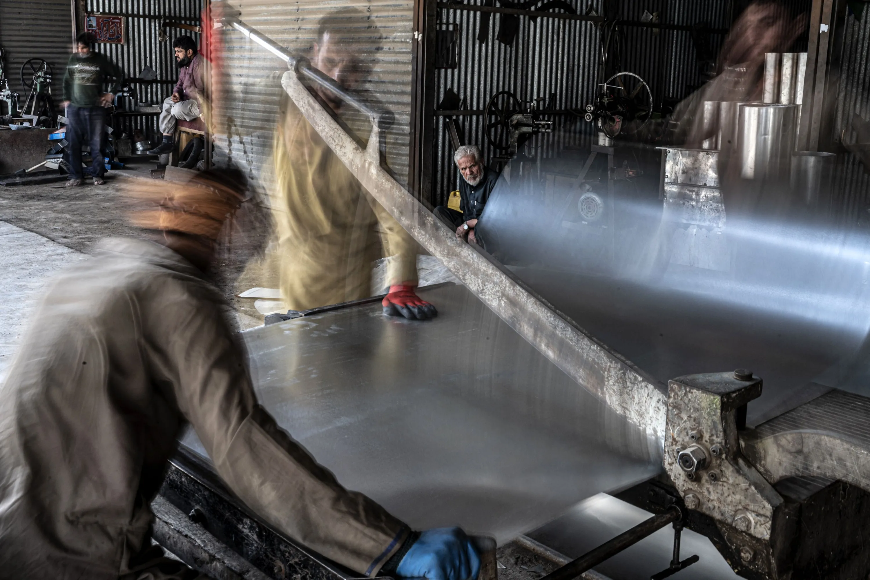 Men work at a tin workshop in Kabul on September 19, 2023. (Photo by Wakil Kohsar/AFP Photo)