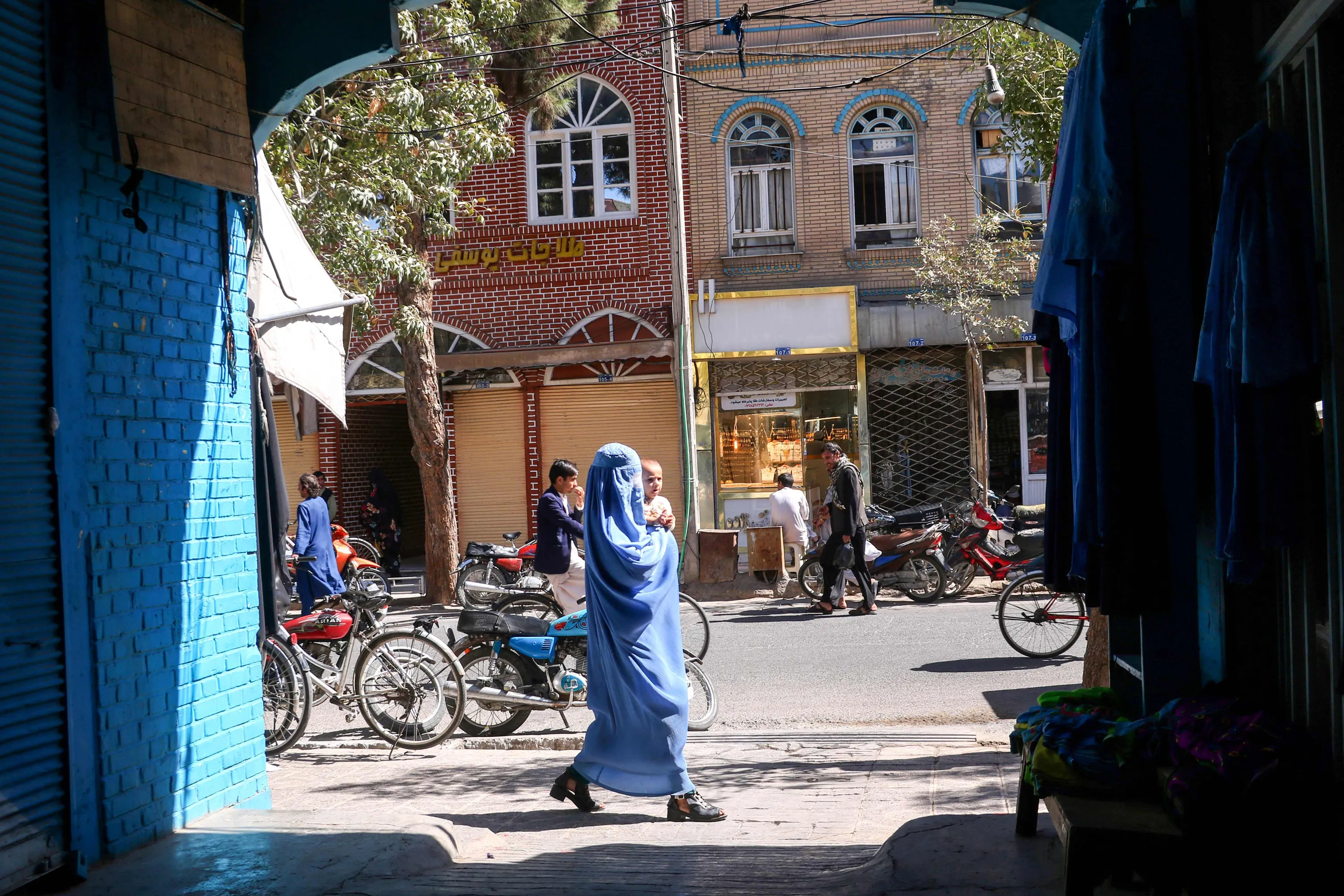 An Afghan burqa-clad woman carries a child as she walks along a road in Herat on October 1, 2023. (Photo by Mohsen Karimi/AFP Photo)