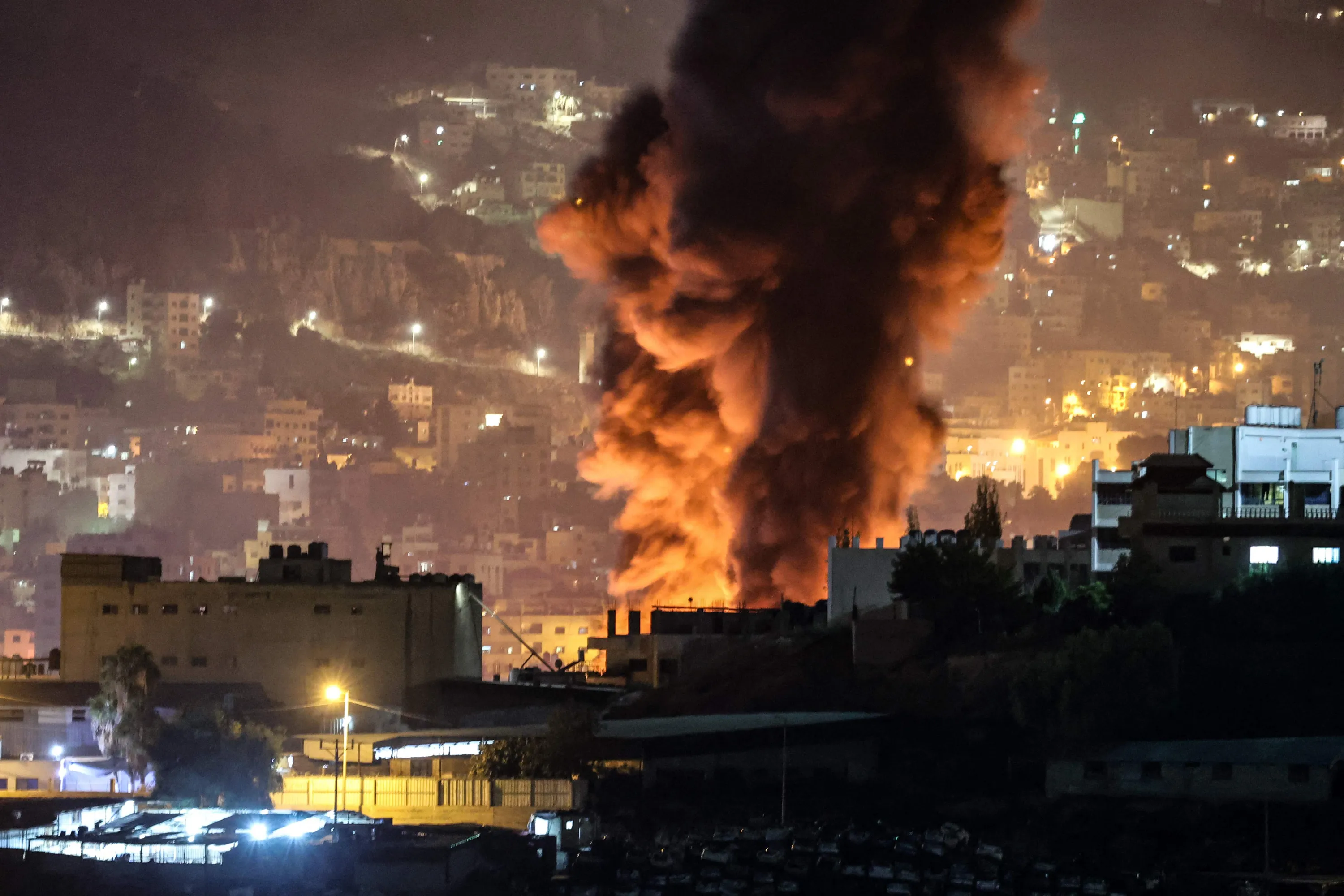 Smoke rises from burning tyres in the eastern area of the occupied West Bank city of Nablus, during clashes between Palestinians and Israeli forces, after the latter entered the city to secure the entry of Jewish worshippers to Joseph's Tomb late on October 4, 2023. (Photo by Zain Jaafar/AFP Photo)