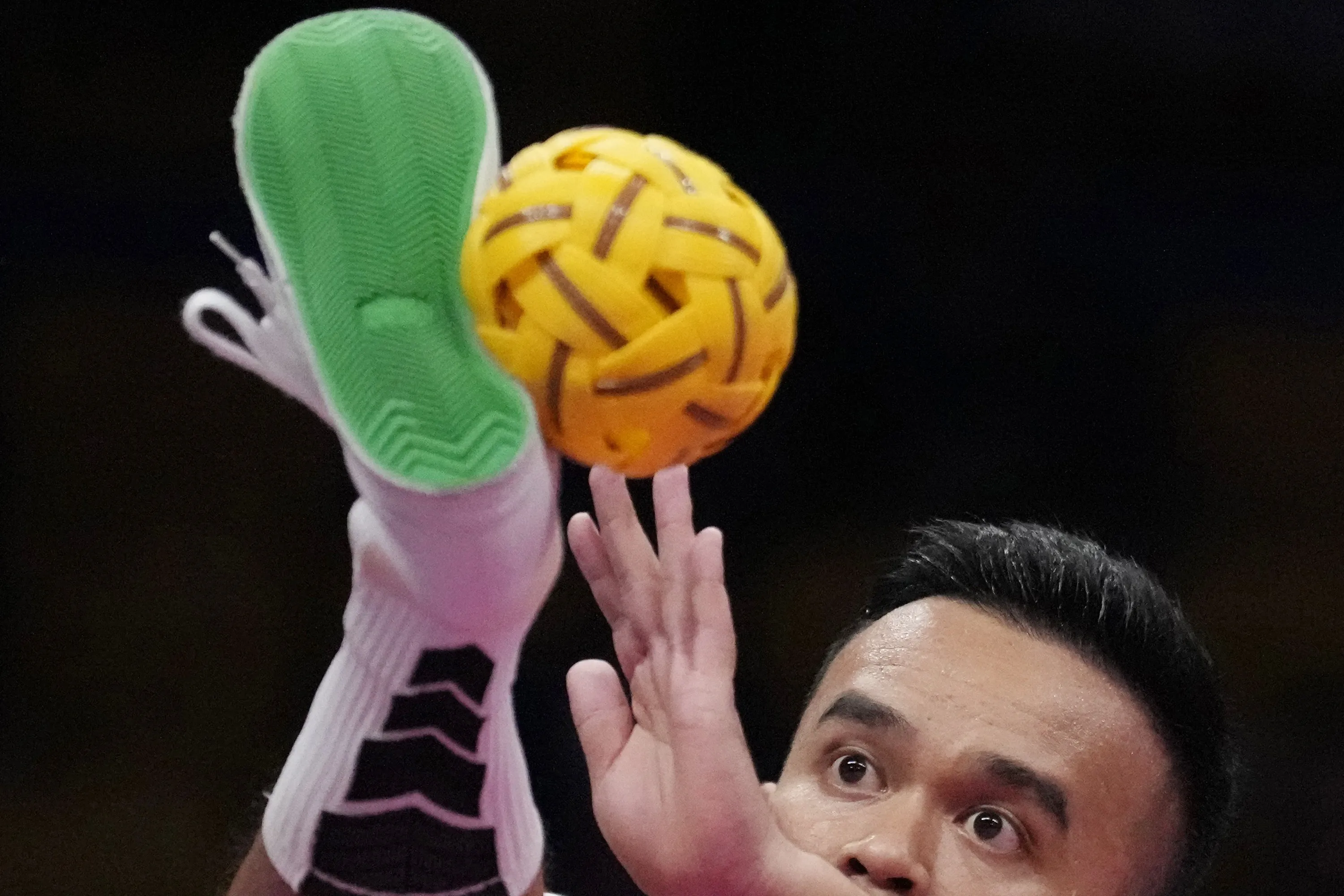 ZIin Ko Ko of Myanmar kicks to serve the ball during men's and women's sepaktakraw preliminary match against Vietnam at Jinhua Sports Centre at the 19th Asian Games in Jinhua, China, Jinhua, Monday, October 2, 2023. (Photo by Eugene Hoshiko/AP Photo)