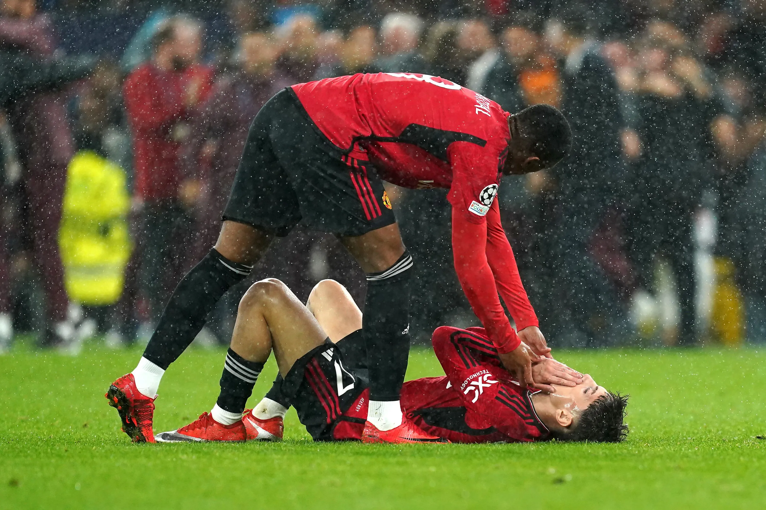 Manchester United's Alejandro Garnacho (right) is consoled by team-mate Anthony Martial after the final whistle in the UEFA Champions League Group A match at Old Trafford, Manchester on Tuesday, October 3, 2023. (Photo by Martin Rickett/PA Wire)