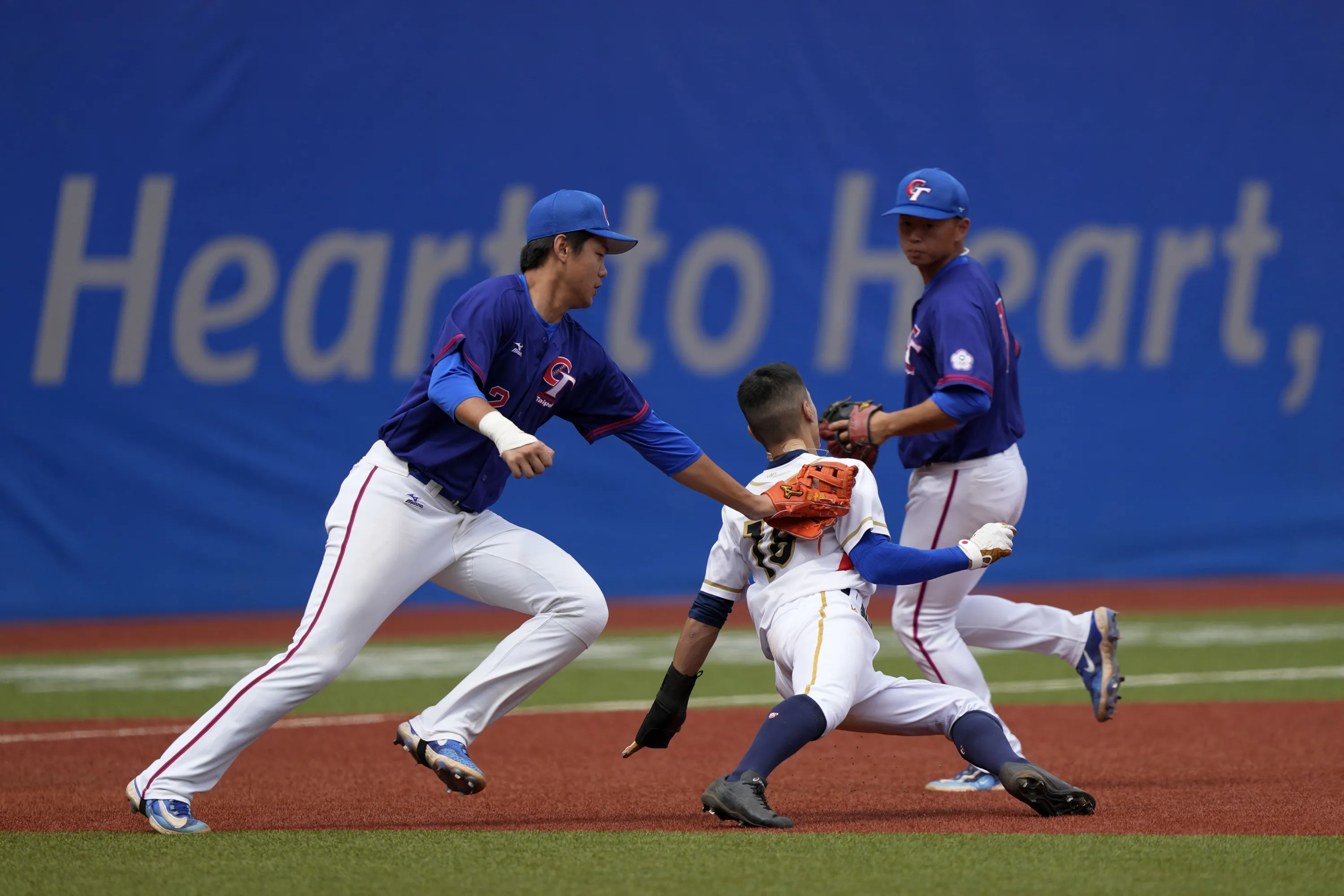 Taiwan's Lin Tzu-Hao tags out Hong Kong's Cheng Hoi Ting during a stage group round B Baseball Men game for the 19th Asian Games in Hangzhou, China on Tuesday, October 3, 2023. At the Asian Games China has been going out of its way to be welcoming to the Taiwanese athletes, as it pursues a two-pronged strategy with the goal of taking over the island, which involves both wooing its people while threatening it militarily. (Photo by Ng Han Guan/AP Photo)