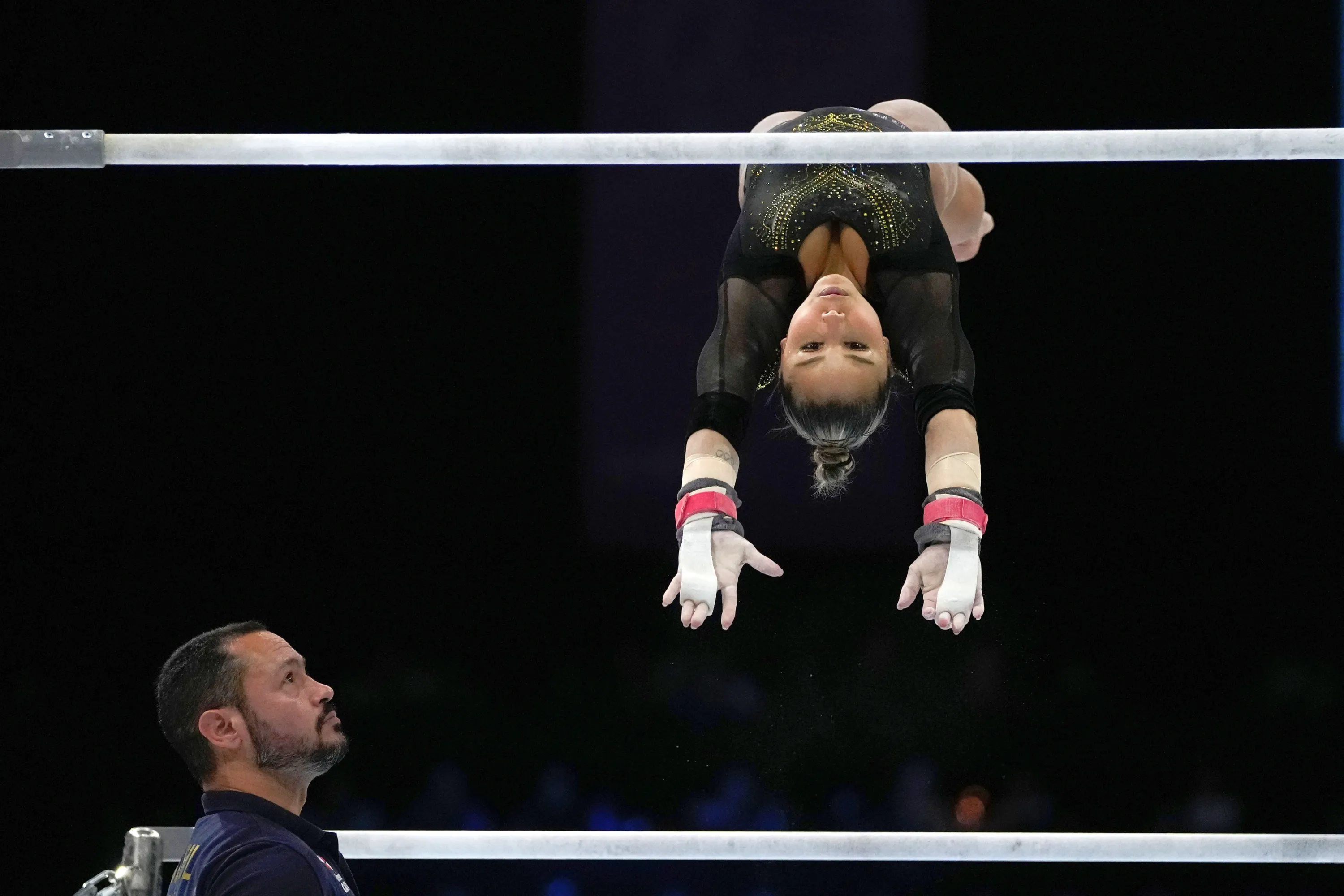 Brazil's Flavia Saraiva competes on the uneven bars during the women's team final at the Artistic Gymnastics World Championships in Antwerp, Belgium, Wednesday, October 4, 2023. (Photo by Virginia Mayo/AP Photo)