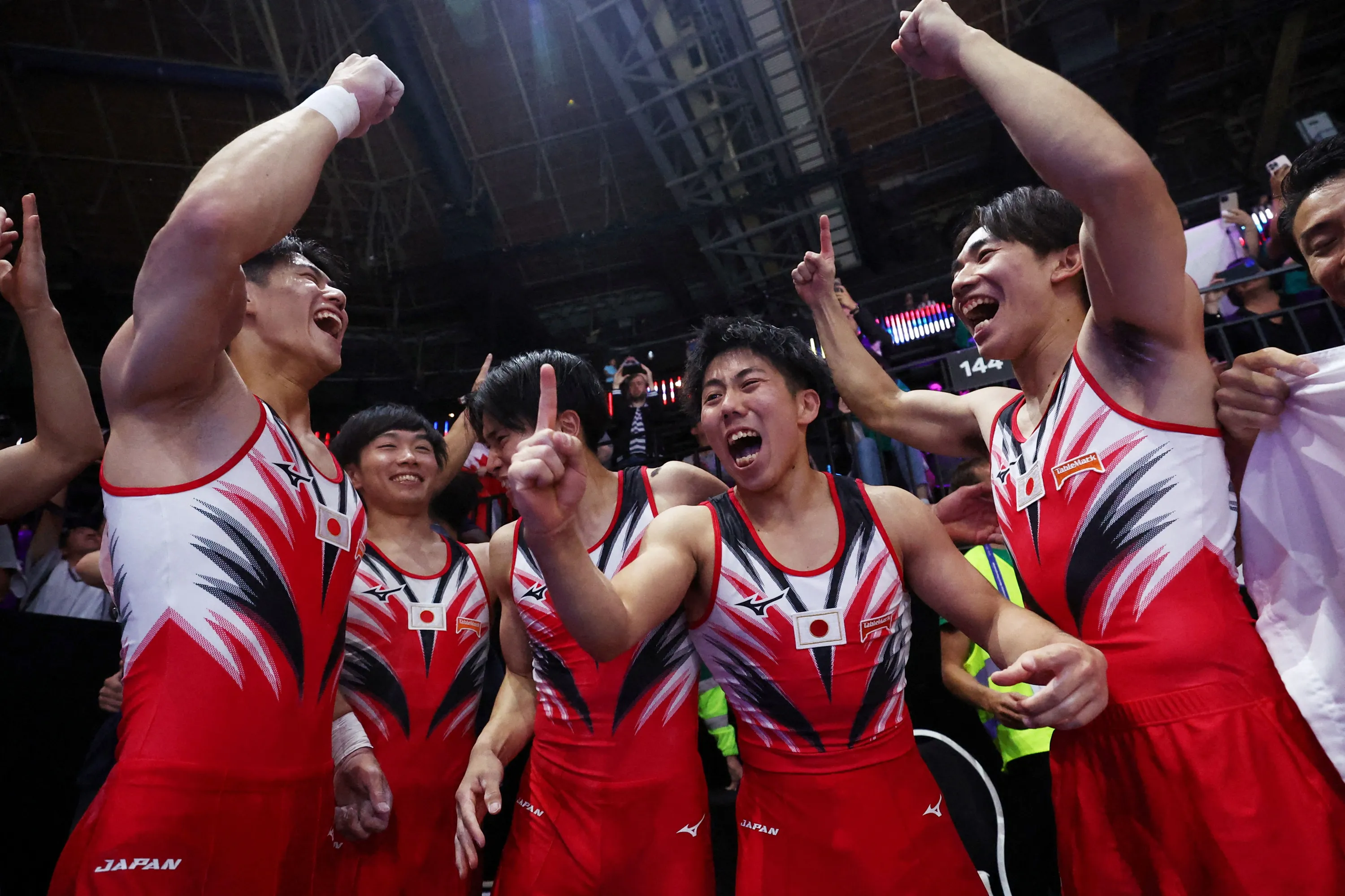 Japan celebrate winning gold at the men's team final at the World Artistic Gymnastics in Antwerp, Belgium on October 3, 2023. (Photo by Yves Herman/Reuters)