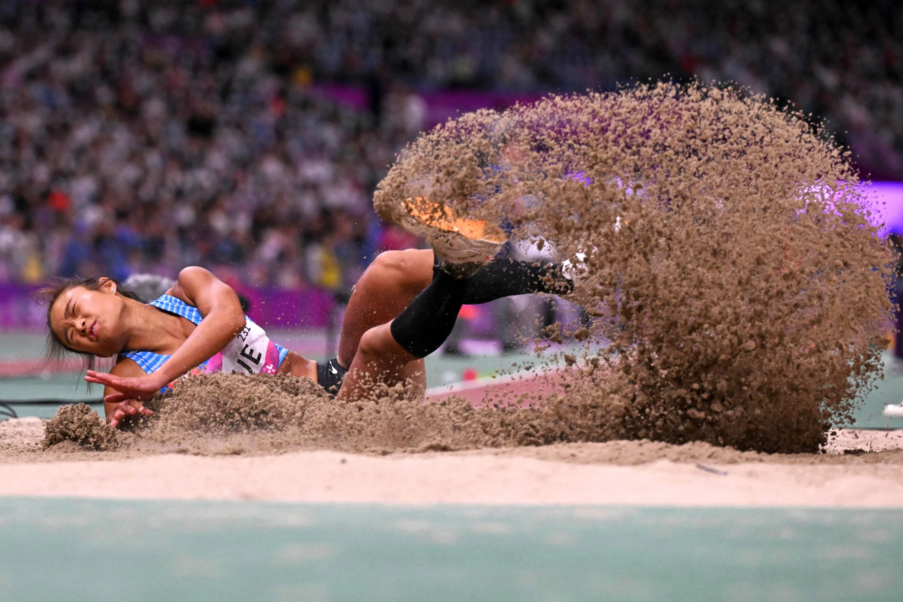 Hong Kong's Yue Nga Yan competes in the women's long jump final athletics event during the 2022 Asian Games in Hangzhou in China's eastern Zhejiang province on October 2, 2023. (Photo by William West/AFP Photo)