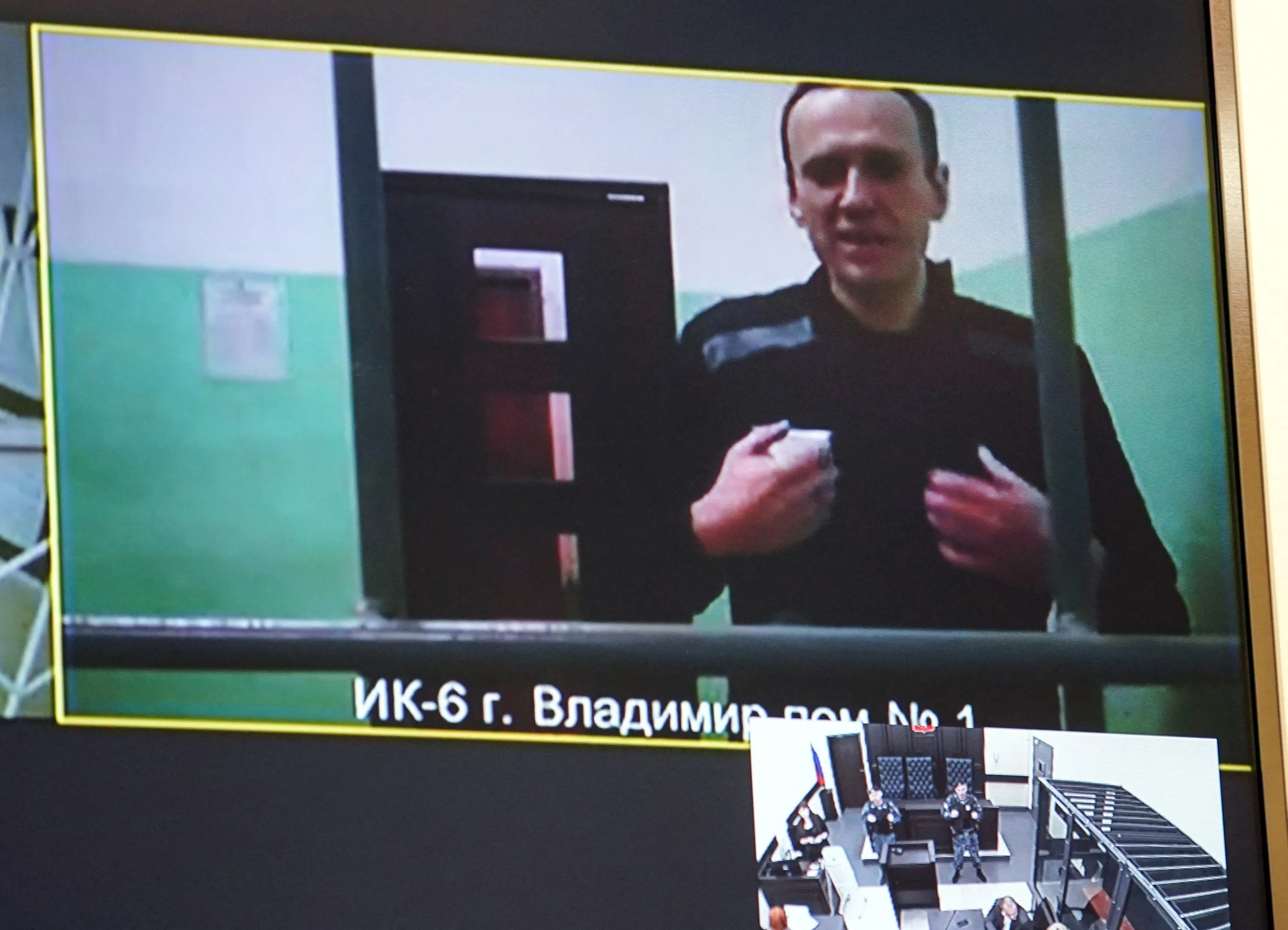 A screen shows jailed Kremlin critic Alexei Navalny as he arrives to listen to a hearing on an appeal lodged against a court decision to jail him for 19 years in a maximum security prison on extremism-linked charges, at a court in Moscow on September 26, 2023. Navalny was Russia's loudest opposition voice over the last decade and galvanised huge anti-government rallies before he was jailed in 2021 on fraud charges that his allies at home and abroad said were punitive. (Photo by Tatyana Makeyeva/AFP Photo)
