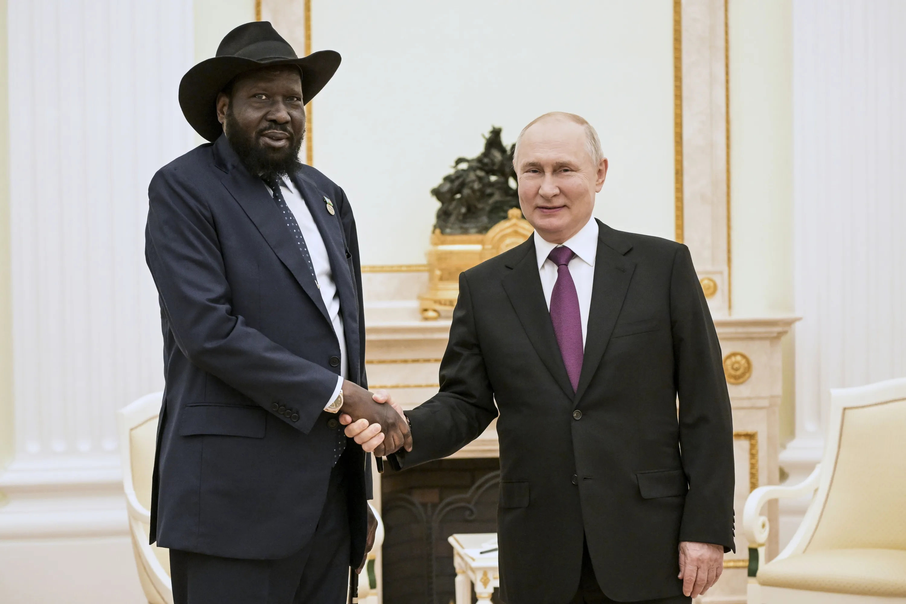 Russian President Vladimir Putin, right, and South Sudan President Salva Kiir Mayardit pose for a photo prior to their talks at the Kremlin in Moscow, Russia, Thursday, September 28, 2023. (Photo by Vladimir Astapkovich, Sputnik, Kremlin Pool Photo via AP Photo)