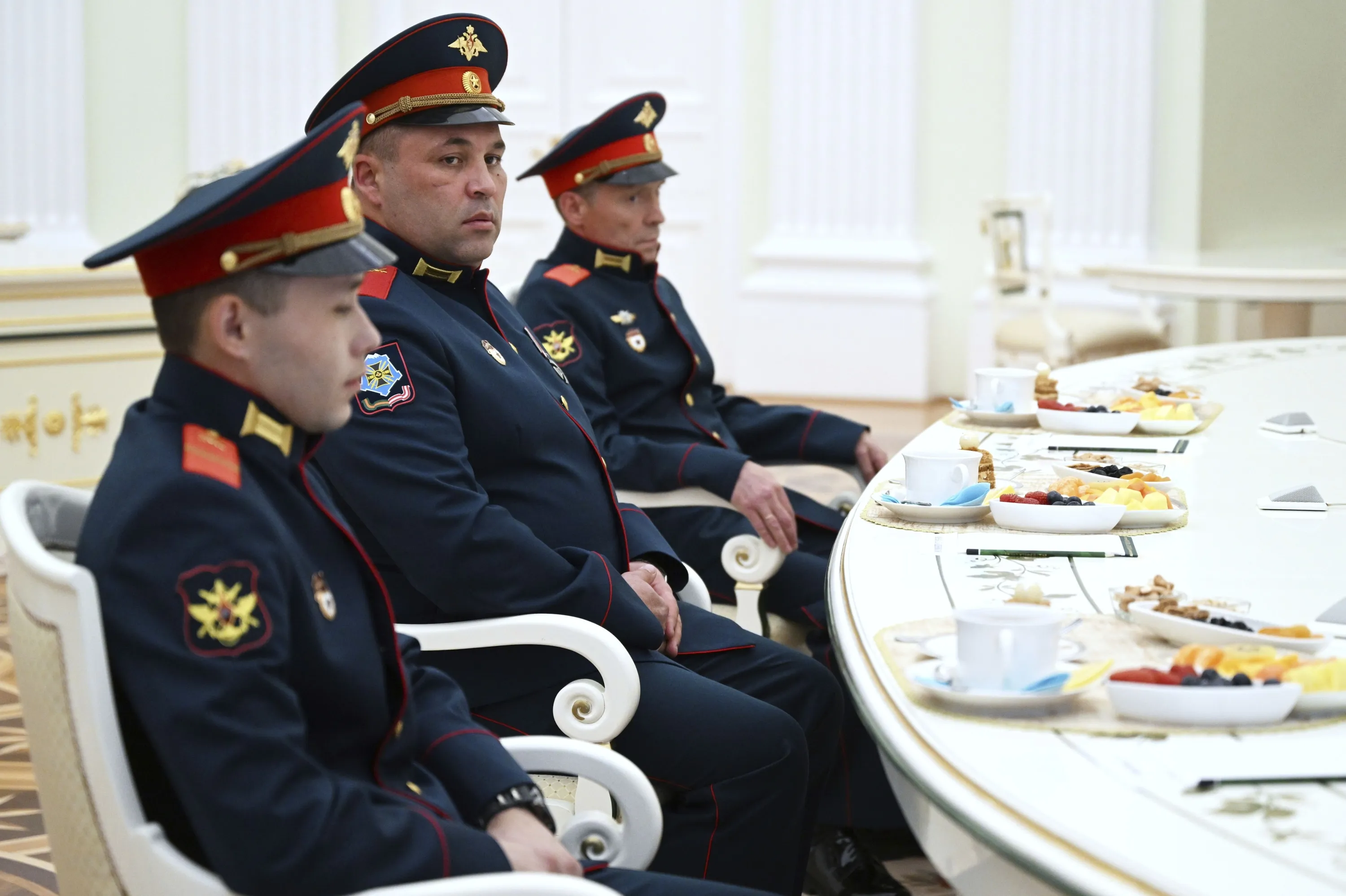 From left: Russian servicemen Cpl. Alexei Ivliev, awarded with the Order of Courage and Hero of the Russian Federation, Pvt. Ivan Kalashnikov and Pvt. Vyacheslav Tarasov, awarded with the Order of Courage, all of them participants of Russian special military operation, attend a meeting with Russian President Vladimir Putin at the Kremlin in Moscow, Russia, Friday, September 29, 2023. (Photo by Pavel Bednyakov, Sputnik, Kremlin Pool Photo via AP Photo)