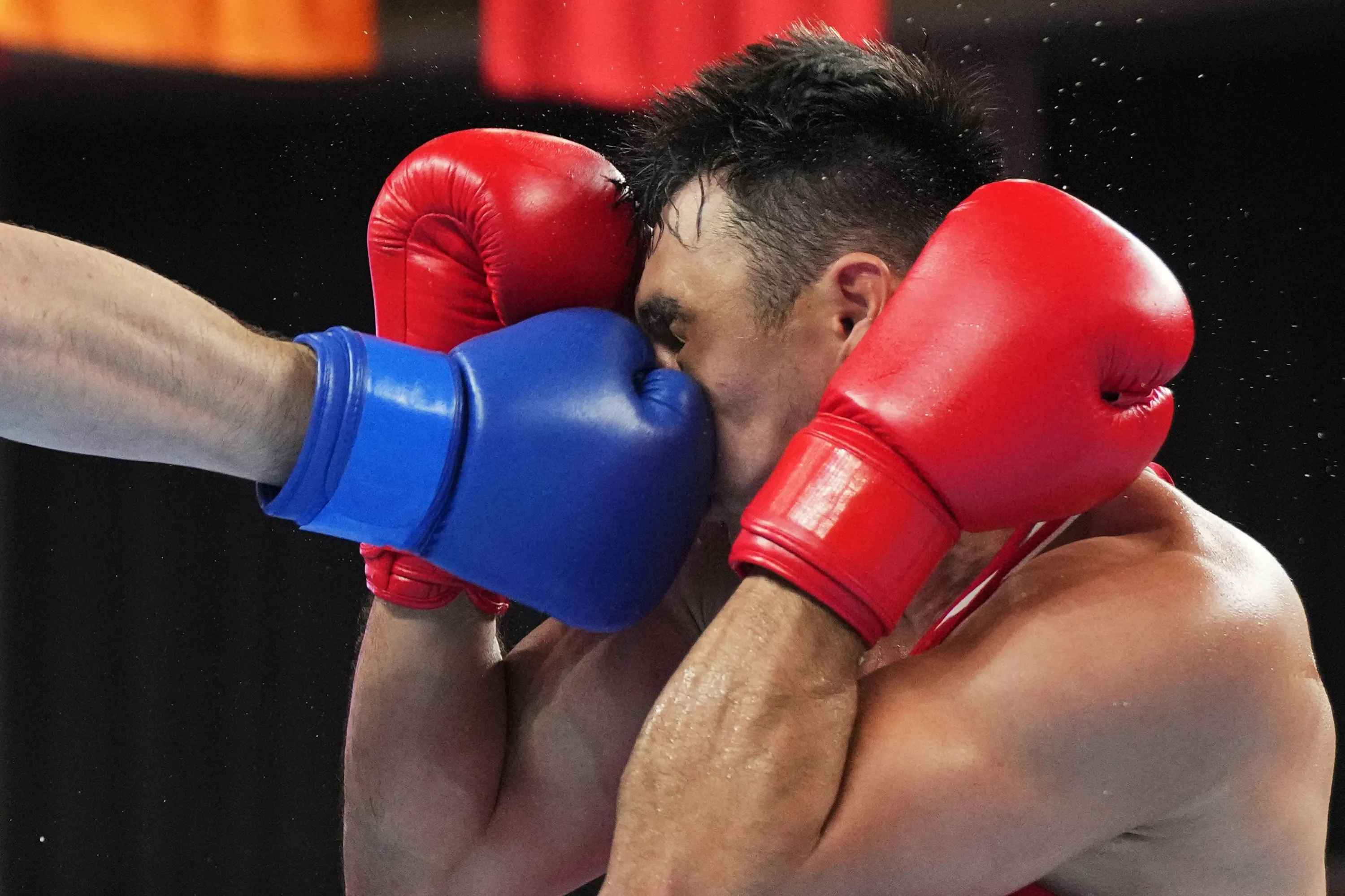 Kazakhstan's Kamshybek Kunkabayev receives a punch from Uzbekistan's Bakhodir Jalolov during the men's +92Kg boxing final at the 19th Asian Games in Hangzhou, China, Thursday, October 5, 2023. (Photo by Vincent Thian/AP Photo)