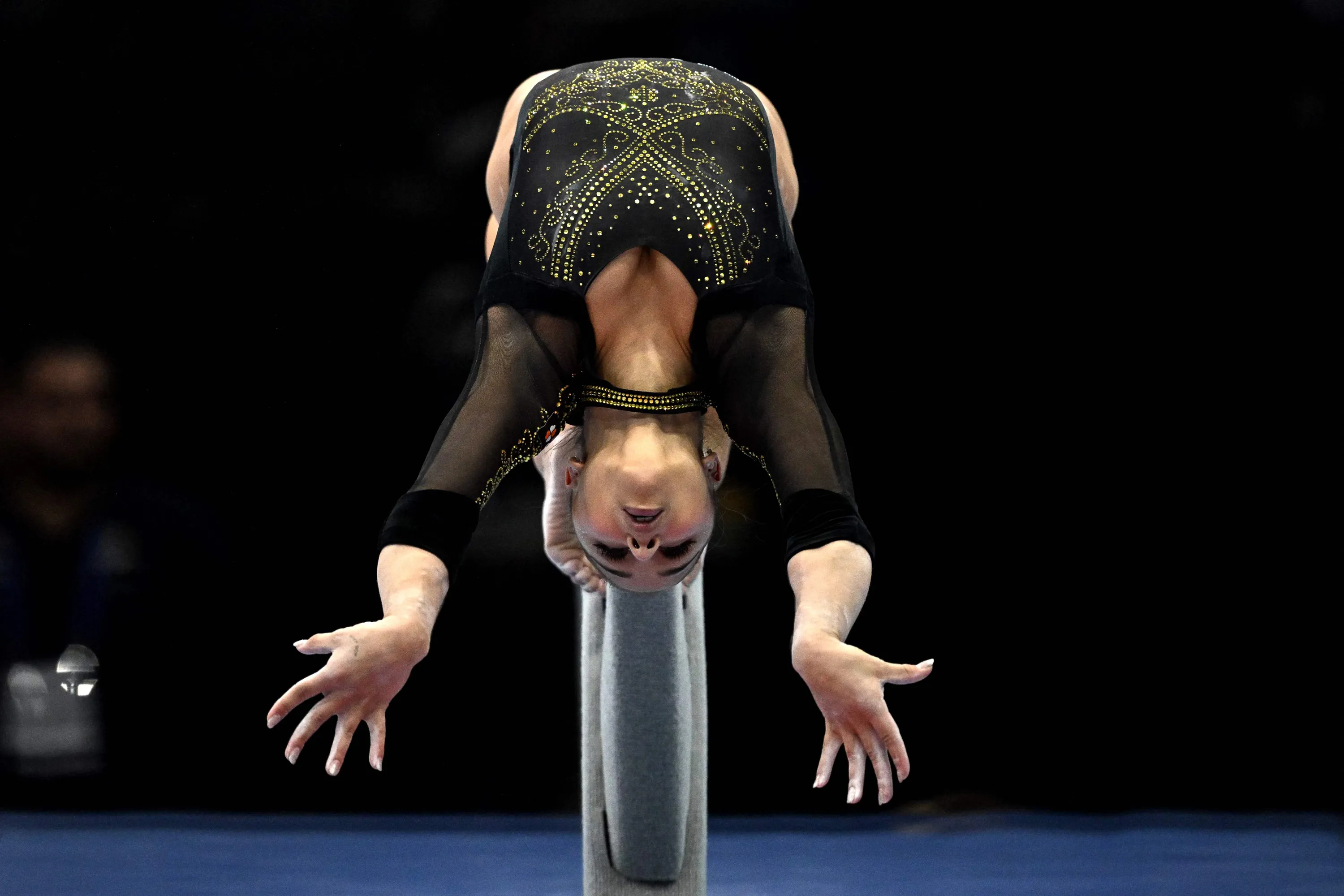 Brasil's Flavia Saraiva competes on the Balance Beam in the Women's Team Final during the 52nd FIG Artistic Gymnastics World Championships, in Antwerp, northern Belgium, on October 4, 2023. (Photo by Lionel Bonaventure/AFP Photo)