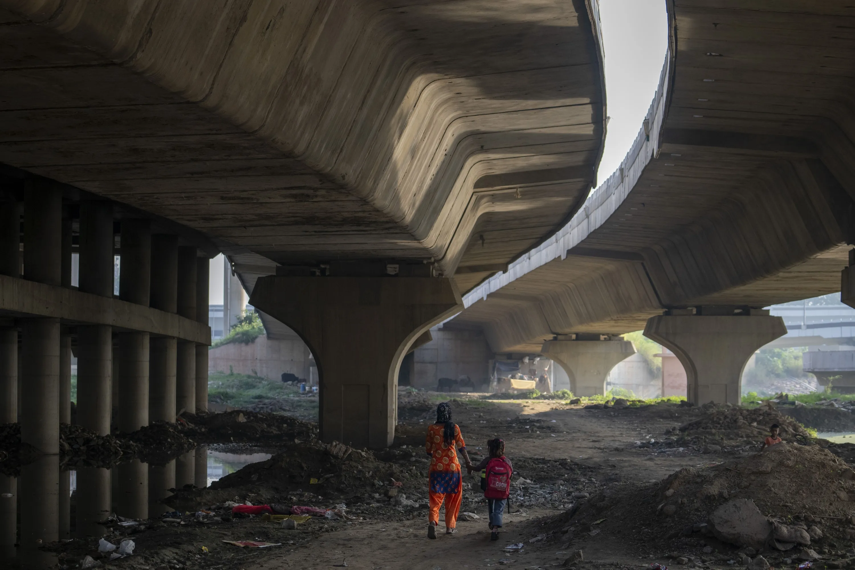 Meera Devi, left, accompanies her daughter Arima, 7, to her school as they walk on the flood plain of Yamuna River, in New Delhi, India, Friday, September 29, 2023. (Photo by Altaf Qadri/AP Photo)