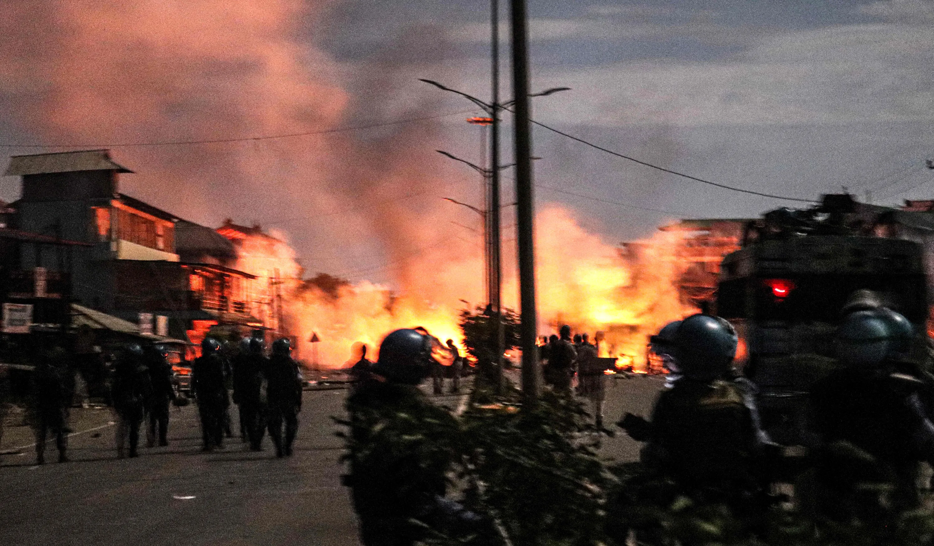 In this photo taken on September 28, 2023, miscreants burn tyres as they protest near the family home of chief minister N Biren Singh, in Imphal in India's northeastern state of Manipur, amid ongoing ethnic violence. Thousands of protestors on September 28 tried to storm the home of the chief minister of a restive Indian state riven by sectarian violence, officials said, adding that extra troops were being called in to try to maintain order. More than 150 people have been killed in the remote northeastern state of Manipur since armed clashes broke out in May between the predominantly Hindu Meitei majority and mainly Christian Kuki community. (Photo by AFP Photo/Stringer)