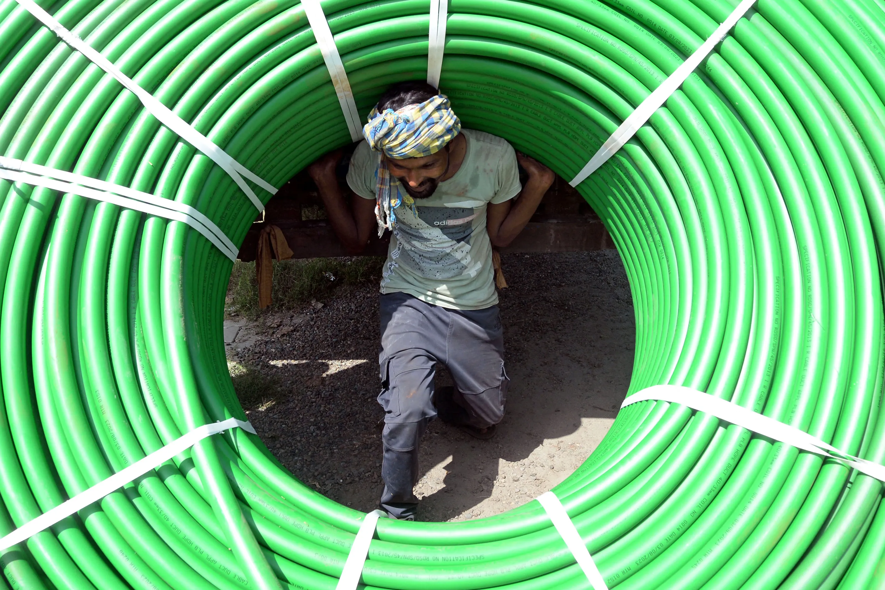 A labourer carries plastic pipe rolls at a railway store in Jalandhar on September 29, 2023. (Photo by Shammi Mehra/AFP Photo)