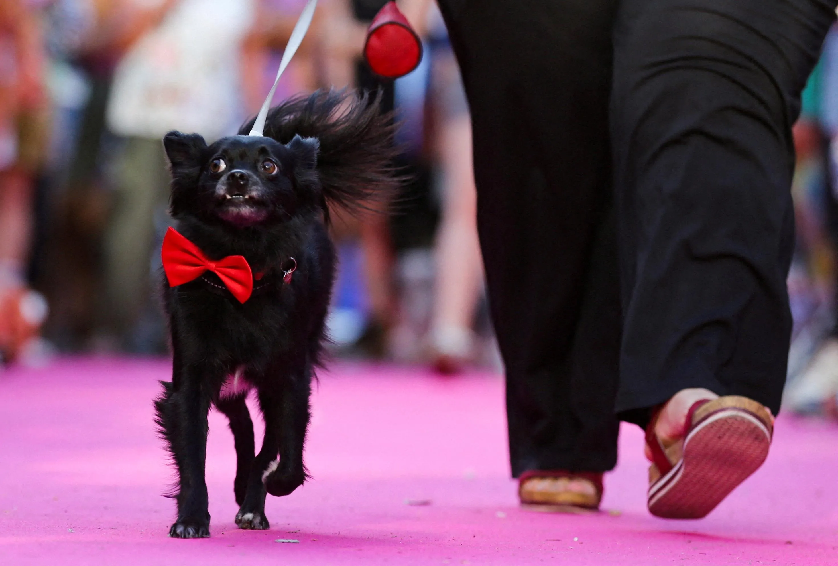 A participant and their pet compete in the “Feathers and Paws” parade as part of the 2022 Pride celebrations, to protest against cruelty to animals in Madrid, Spain on July 3, 2022. (Photo by Isabel Infantes/Reuters)