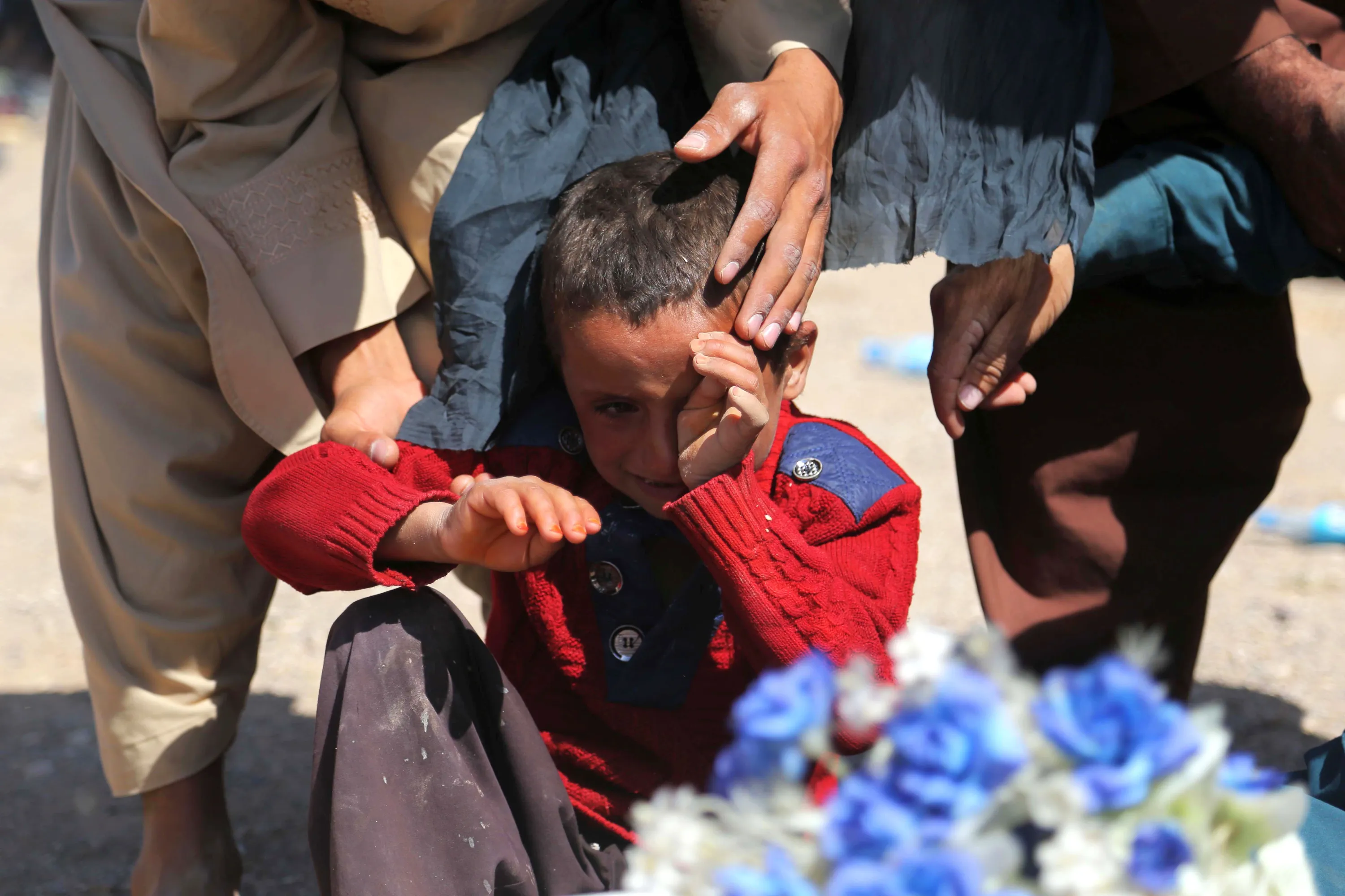 A boy reacts next to the body of his sister who was killed in earthquake, in Zinda Jan district of Herat, Afghanistan, 10 October 2023. A 6.3-magnitude earthquake and the consecutive aftershocks that struck western Afghanistan during the weekend killed nearly 3,000, according to estimates by the government and nonprofit organizations. Over 2,000 people were wounded and 20 villages completely destroyed in the tremors. (Photo by Samiullah Popal/EPA/EFE)