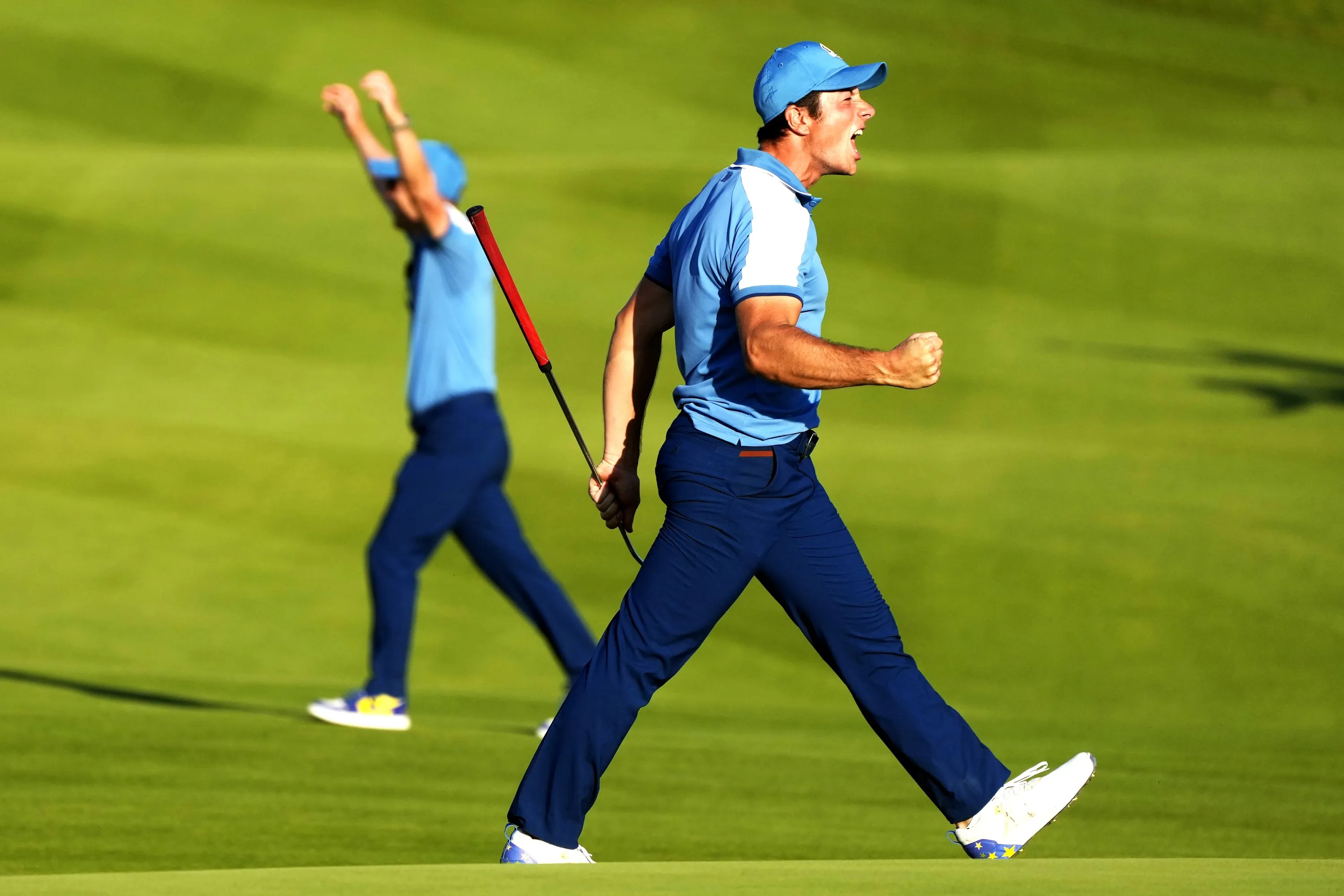 Europe's Viktor Hovland reacts and celebrates after his birdie putt earned Europe a tie in his afternoon Fourballs match at the Ryder Cup golf tournament at the Marco Simone Golf Club in Guidonia Montecelio, Italy, Friday, September 29, 2023. (Photo by Gregorio Borgia/AP Photo)