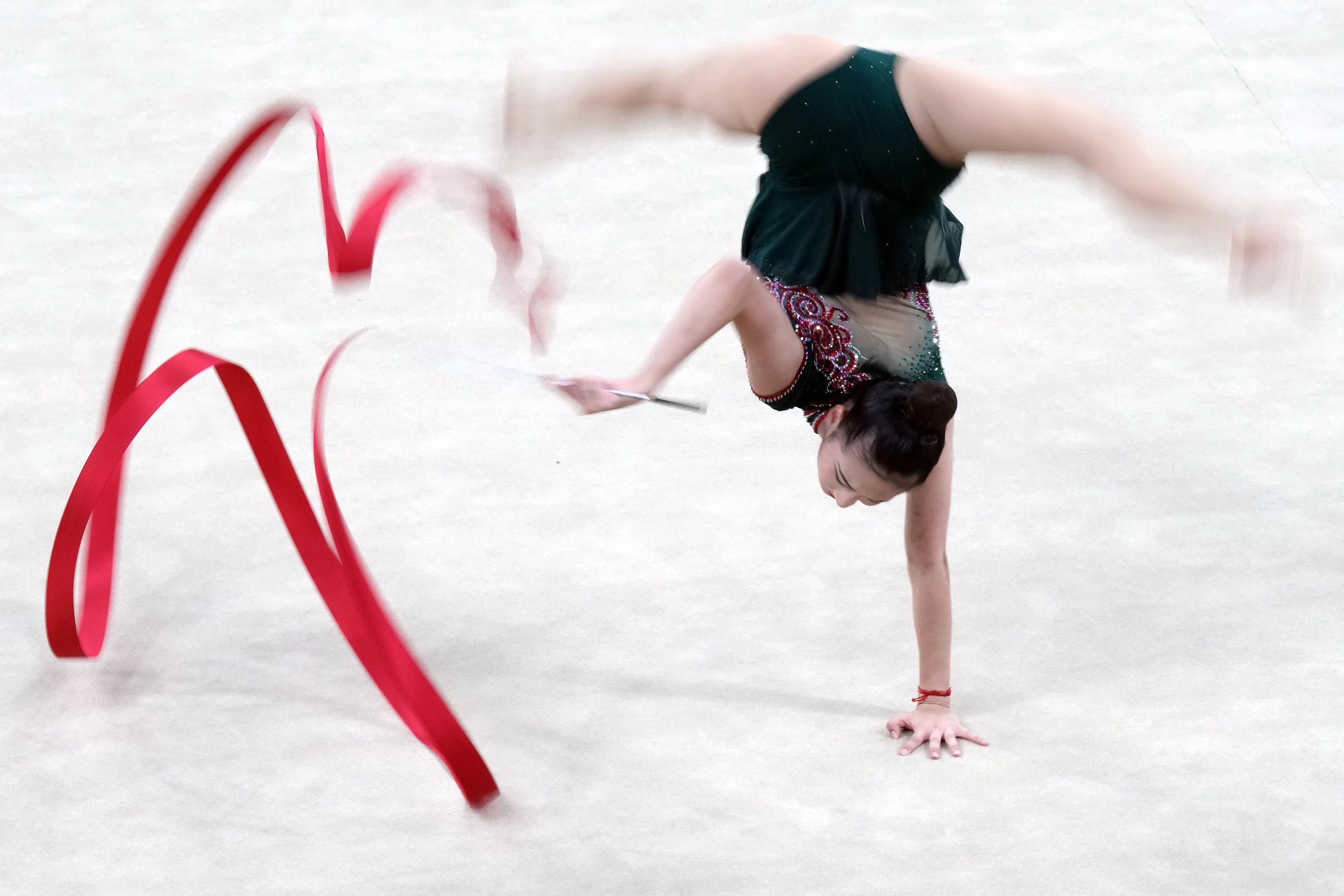 Wang Zulu of China performs during Individual qualification and Individual team final subdivision 2 of Rhythmic Gymnastics final at the 19th Asian Games in Hangzhou, China, Friday, October 6, 2023. (Photo by Eugene Hoshiko/AP Photo)