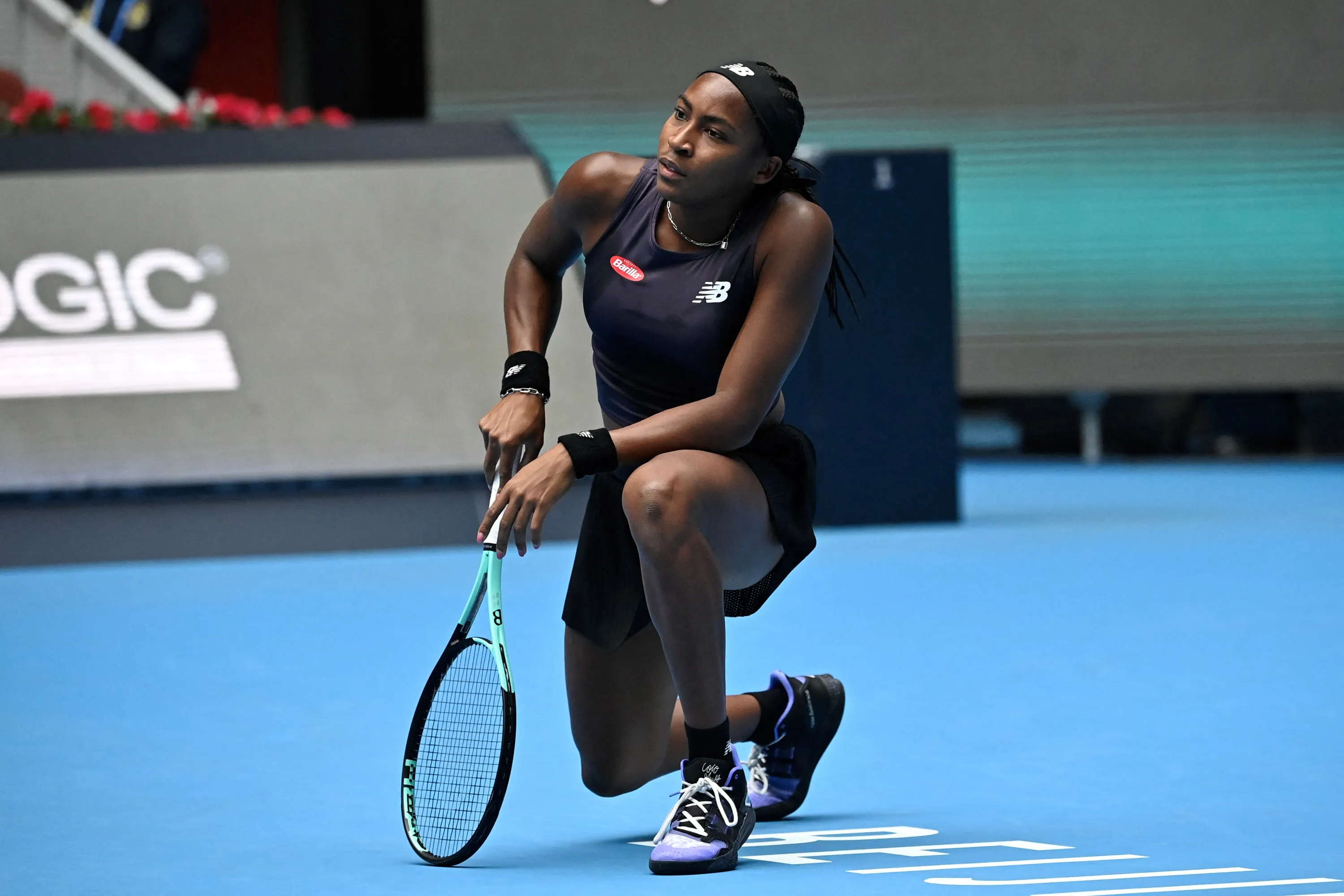 USA`s Coco Gauff reacts during her women's singles match against Russia's Veronika Kudermetova of the WTA China Open tennis tournament in Beijing on October 5, 2023. (Photo by Pedro Pardo/AFP Photo)