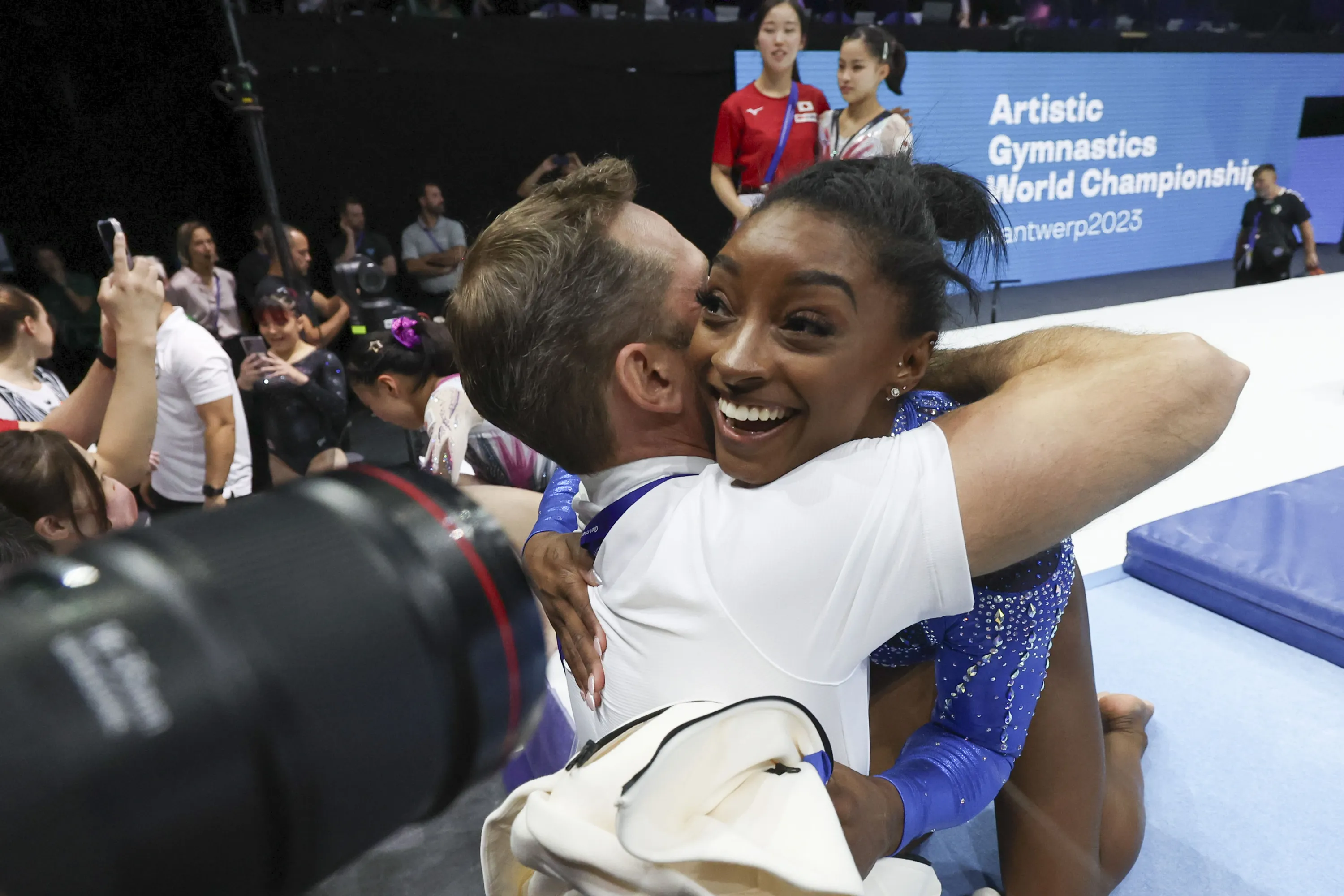 United States' Simone Biles celebrates with her coach after winning the gold medal during the women's all-round final at the Artistic Gymnastics World Championships in Antwerp, Belgium, Friday, October 6, 2023. (Photo by Geert Vanden Wijngaert/AP Photo)