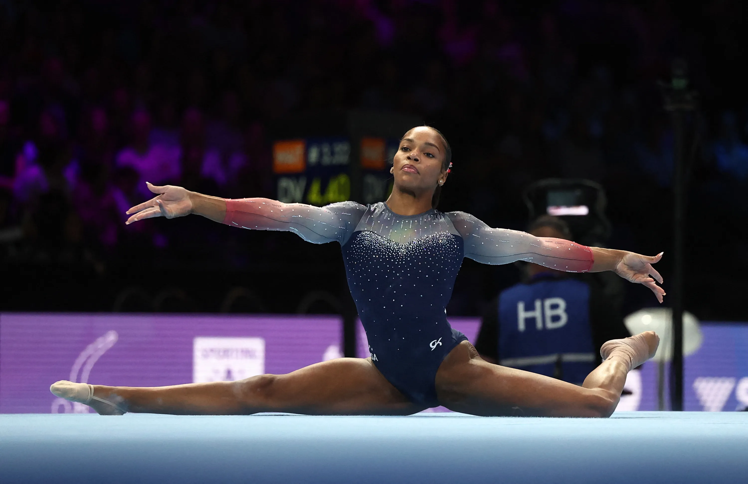 Shilese Jones of the U.S. in action on the floor during the women's team final at Sportpaleis in Antwerp, Belgium on October 4, 2023. (Photo by Yves Herman/Reuters)