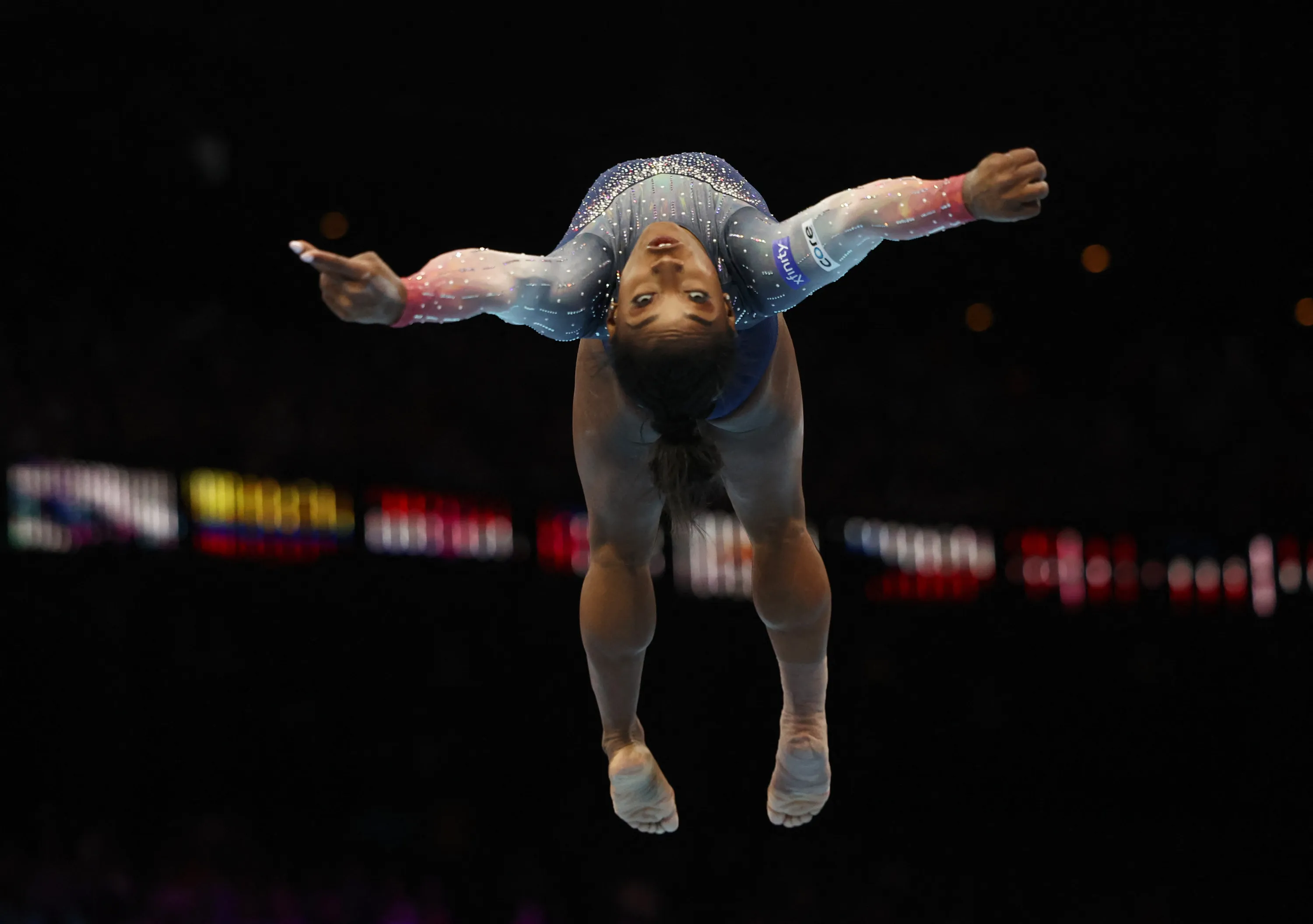 Simone Biles of the U.S. in action on the floor during the women's team final at the World Artistic Gymnastics in Antwerp, Belgium on October 4, 2023. (Photo by Yves Herman/Reuters)