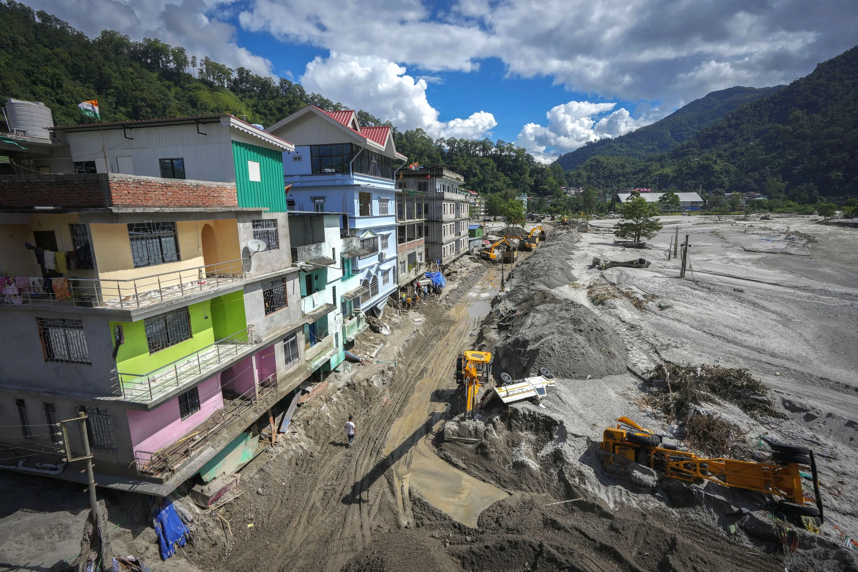 Vehicles that got washed away in floods lie on the sand as machinery is used to clean mud and sand near the buildings along the Teesta river in Rongpo, east Sikkim, India, Sunday, October. 8. 2023. Rescuers continued to dig through slushy debris and ice-cold water in a hunt for survivors after a glacial lake burst through a dam in India’s Himalayan northeast, shortly after midnight Wednesday, washing away houses and bridges and forcing thousands to flee. (Photo by Anupam Nath/AP Photo)