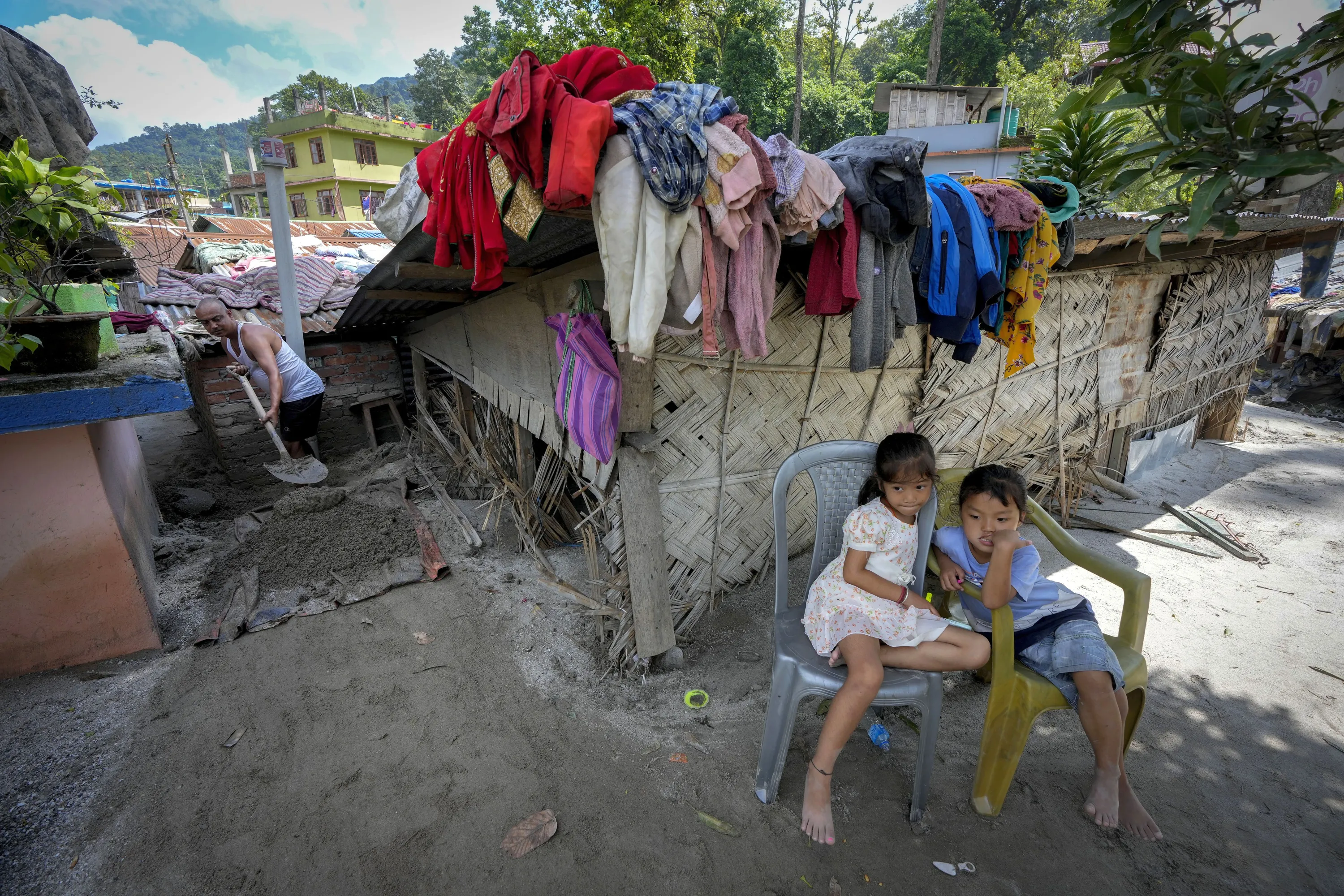 Children sit as a flood affected man removes mud and sand near his previously submerged house along the Teesta river in Rongpo, east Sikkim, India, Sunday, October. 8. 2023. (Photo by Anupam Nath/AP Photo)