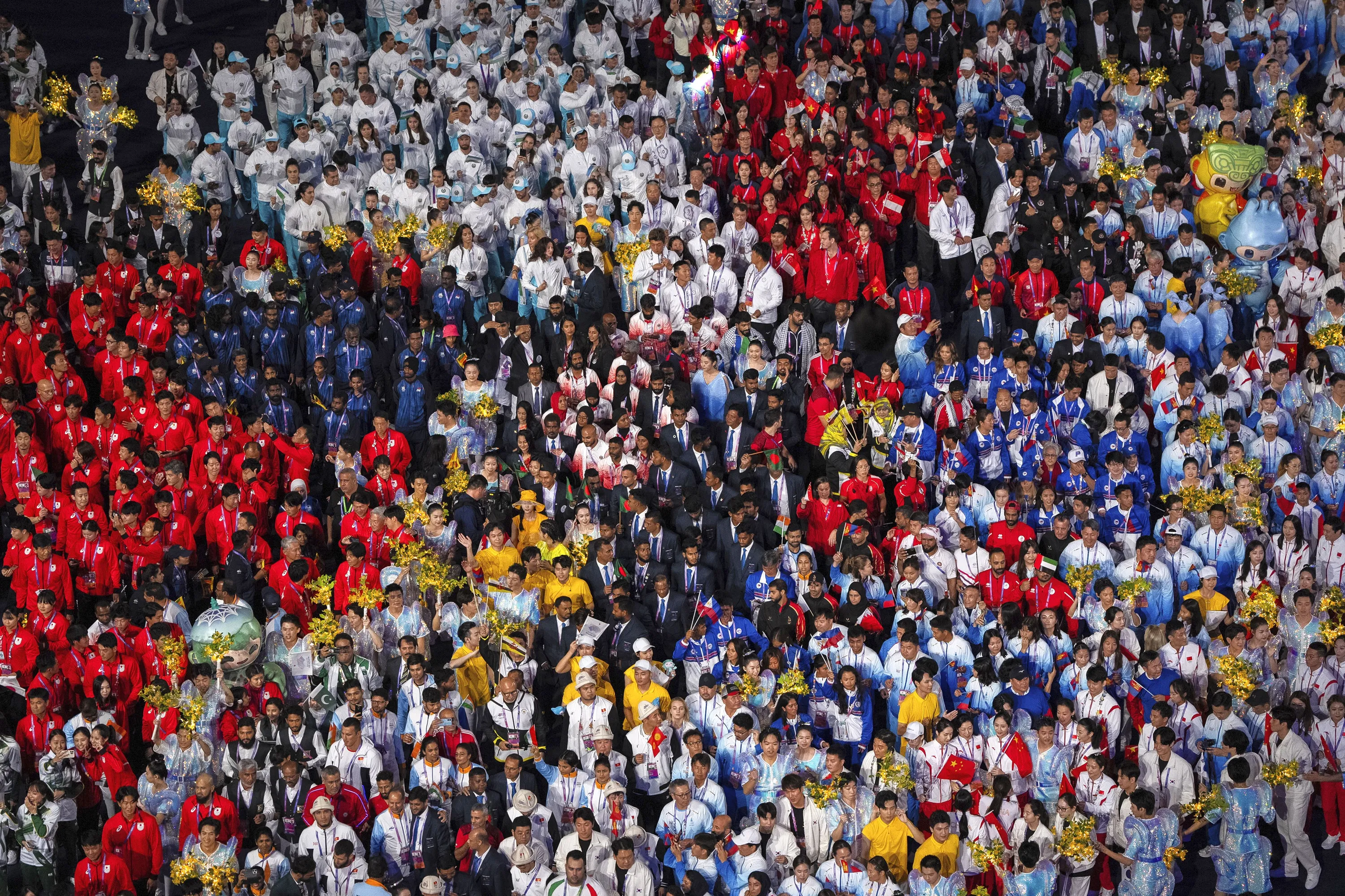 Athletes and team officials from participating countries gather for the closing ceremony of the 19th Asian Games in Hangzhou, China, Sunday, October 8, 2023. (Photo by Louise Delmotte/AP Photo)