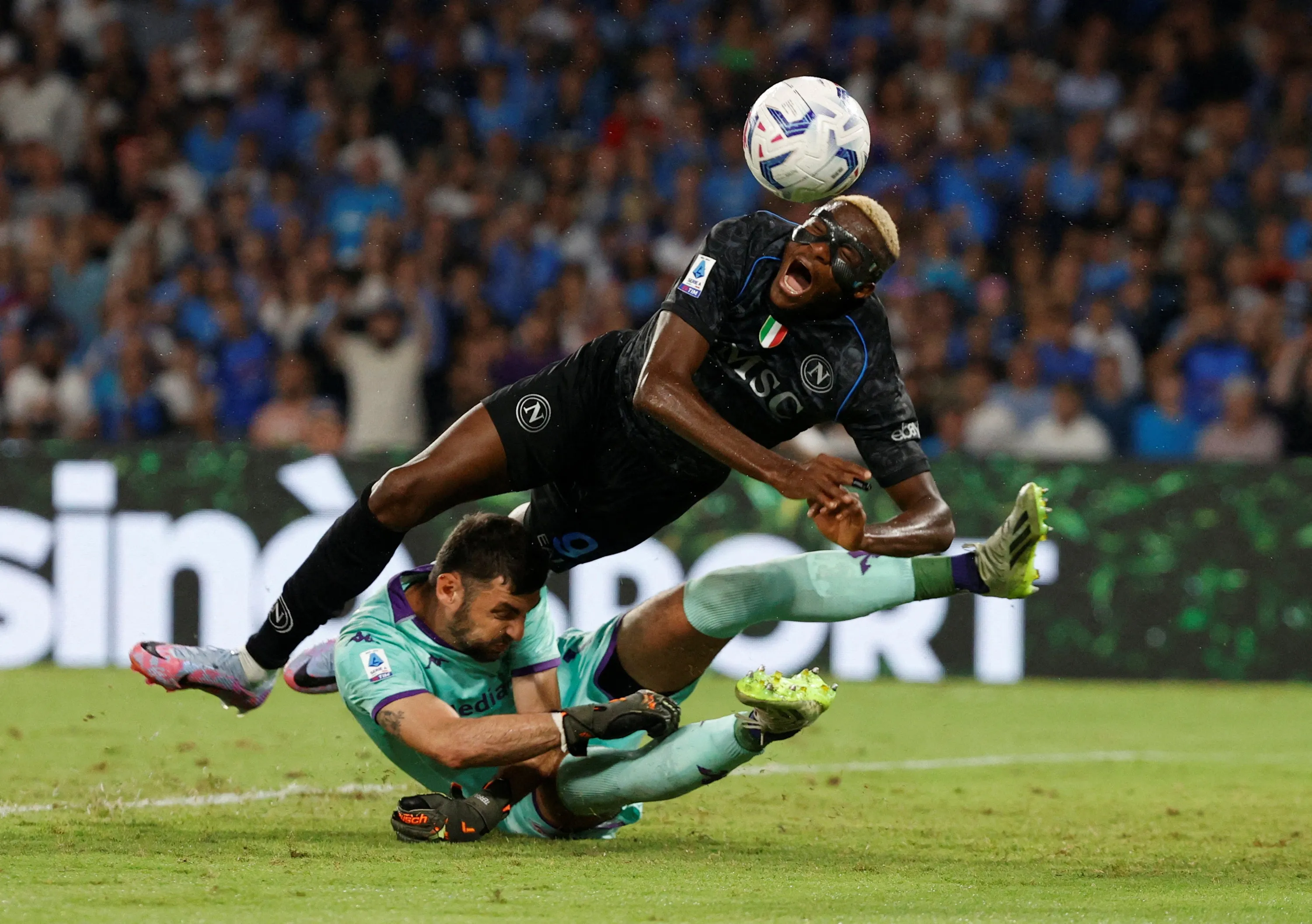 Fiorentina's Pietro Terracciano fouls Napoli's Victor Osimhen to concede a penalty at Stadio Diego Armando Maradona in Naples, Italy on October 8, 2023. (Photo by Ciro De Luca/Reuters)