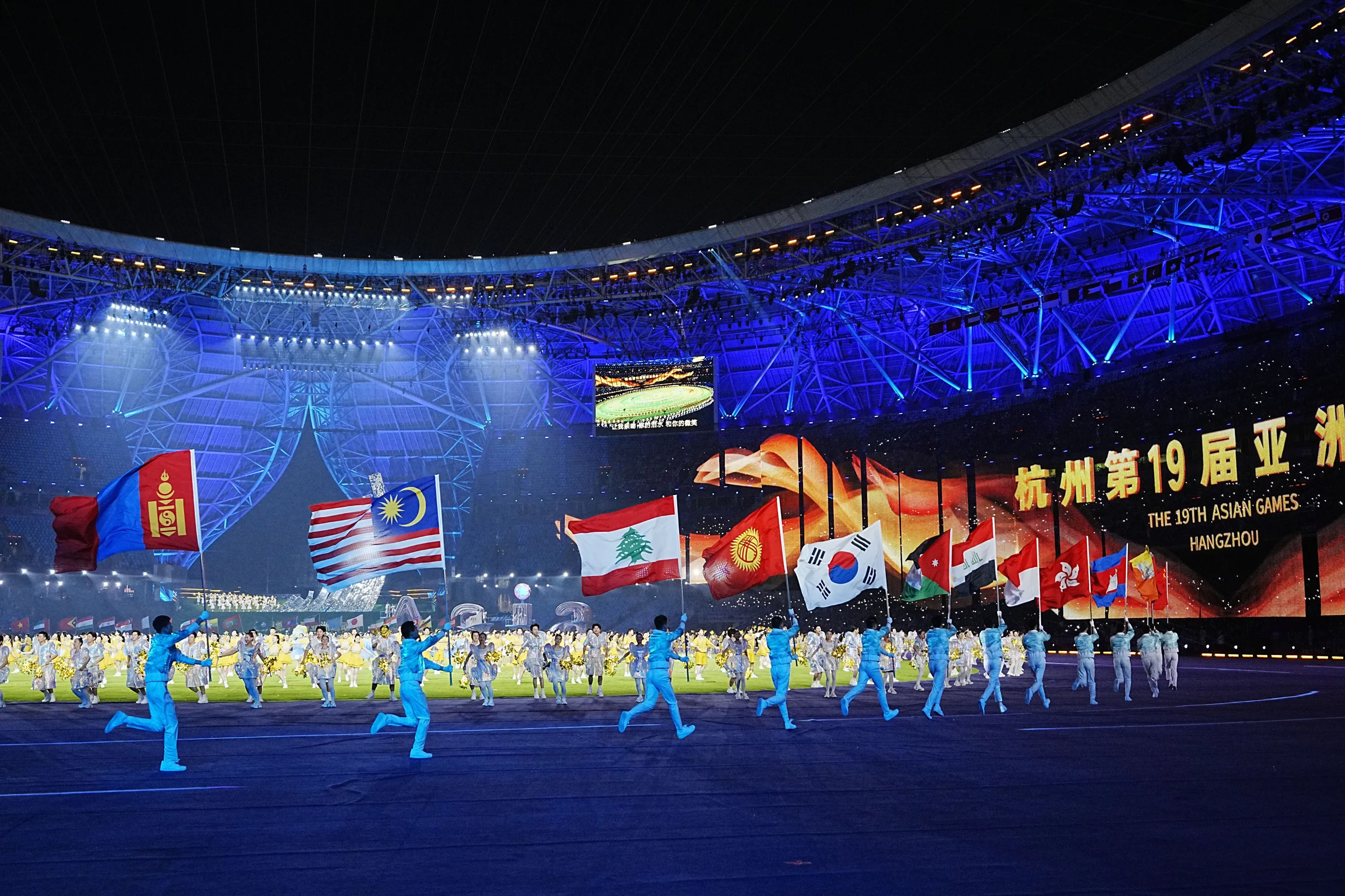 Flags of the participating countries are carried during the closing ceremony of the 19th Asian Games in Hangzhou, China, Sunday, October 8, 2023. (Photo by Vincent Thian/AP Photo)