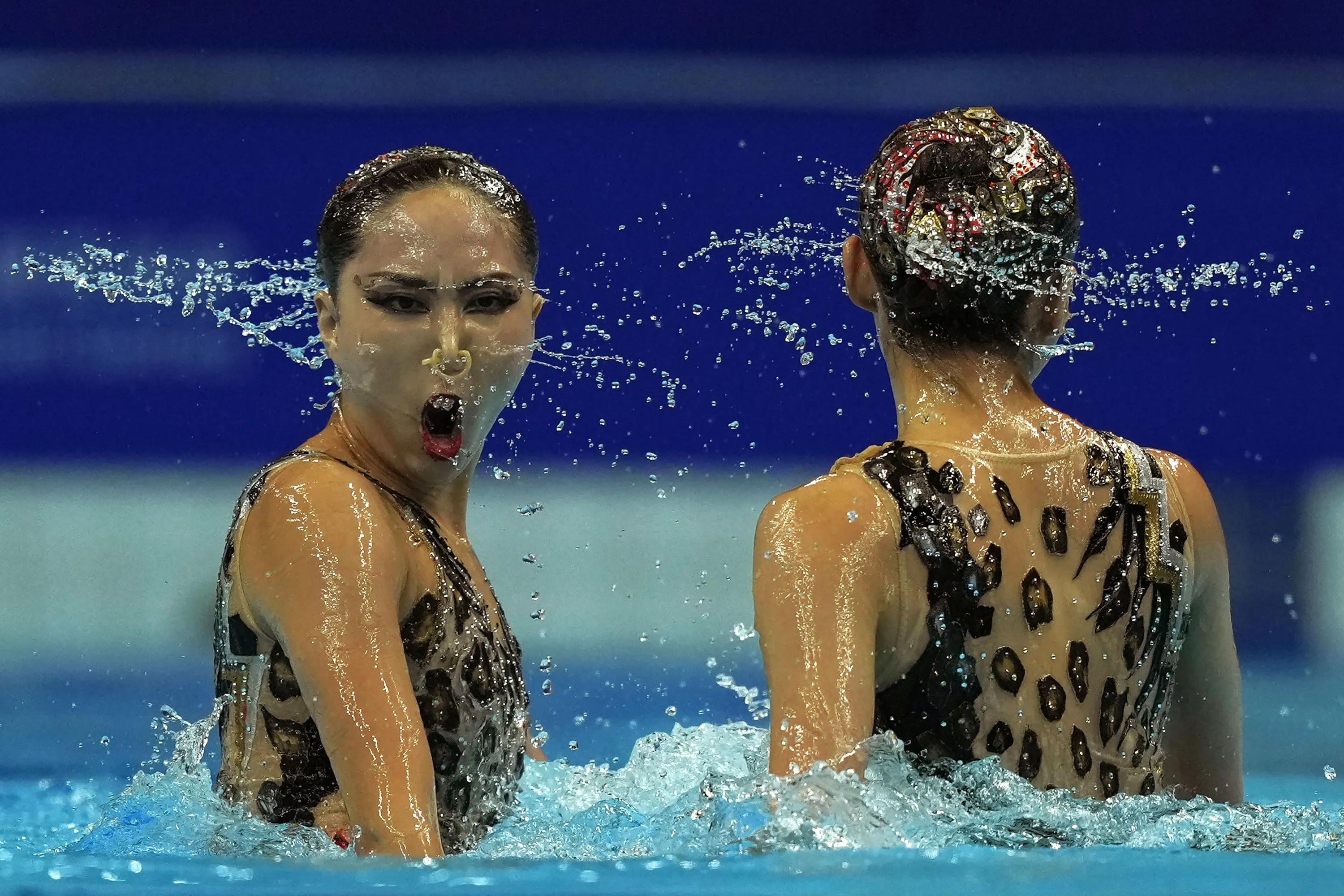 Gold medalists China's Wang Liuyi and Wang Qianyi takes part in the Free Routine segment of the Artistic Swimming Women's Duet competition at the 19th Asian Games in Hangzhou, China, Saturday, October 7, 2023. (Photo by Ng Han Guan/AP Photo)