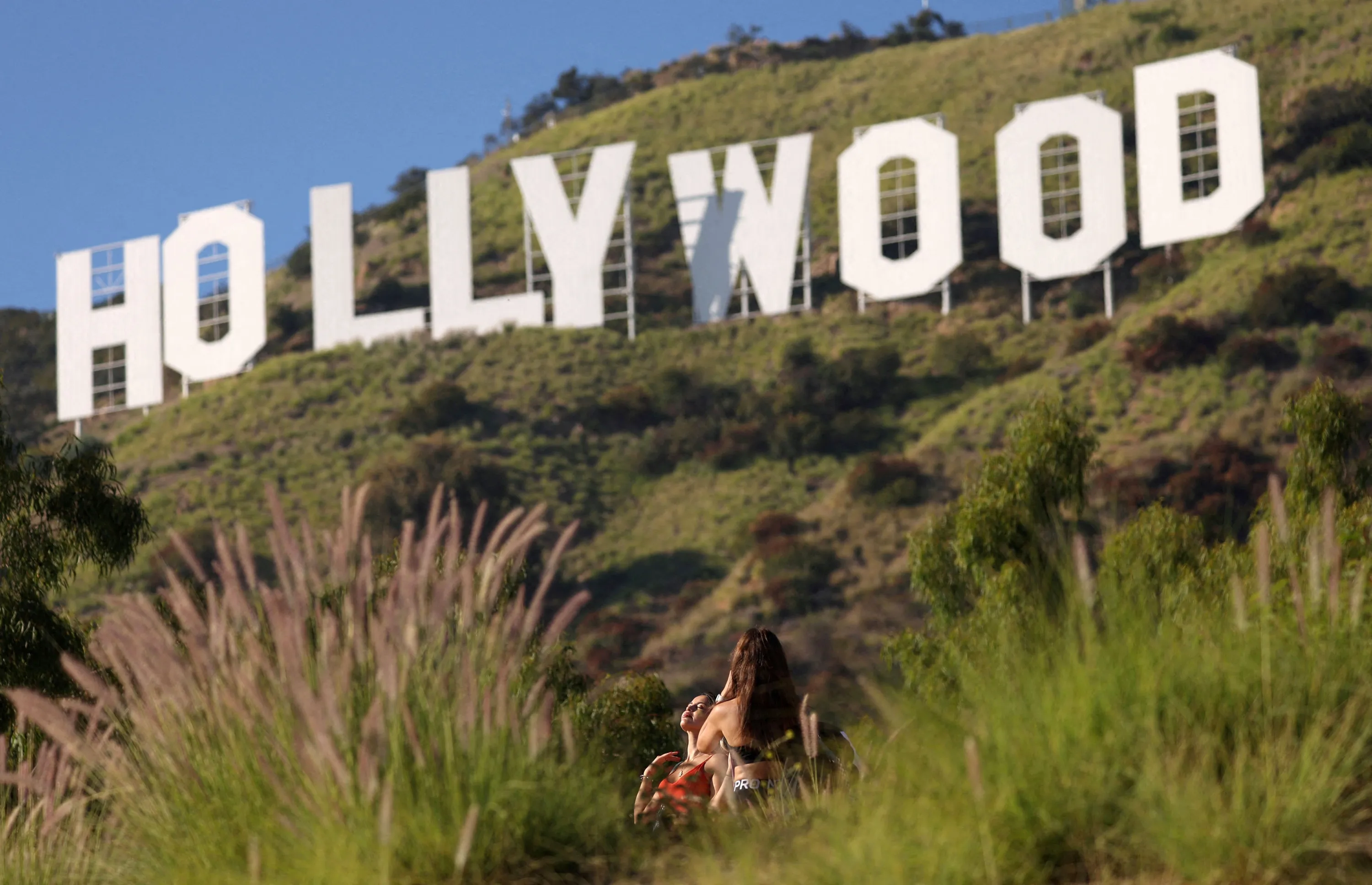 A woman poses by the iconic Hollywood sign on the day members of the Writers Guild of America (WGA) approved a new three-year contract with major studios, in Los Angeles, California, U.S., October 9, 2023. (Photo by Mario Anzuoni/Reuters)