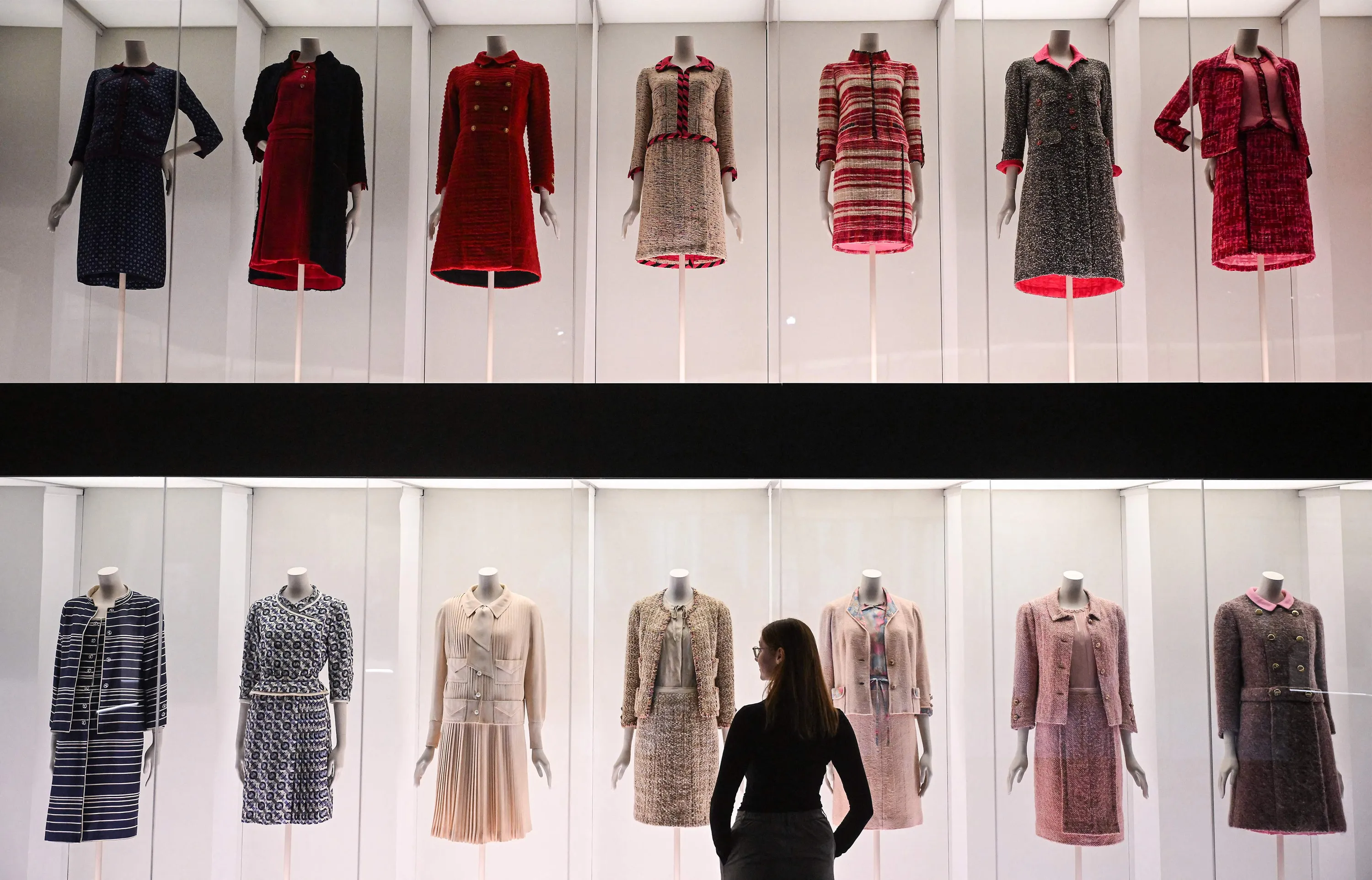 Members of staff looks at the different dresses and outfits displayed during the press photocall for the exhibition “Gabrielle Chanel, Fashion Manifesto” at the V&A museum in London, on September 12, 2023. “Gabrielle Chanel, Fashion Manifesto” is the first UK major exhibition dedicated to the work of the pioneering French fashion designer. It will run from September 16, 2023 to February 25, 2024. (Photo by Justin Tallis/AFP Photo)