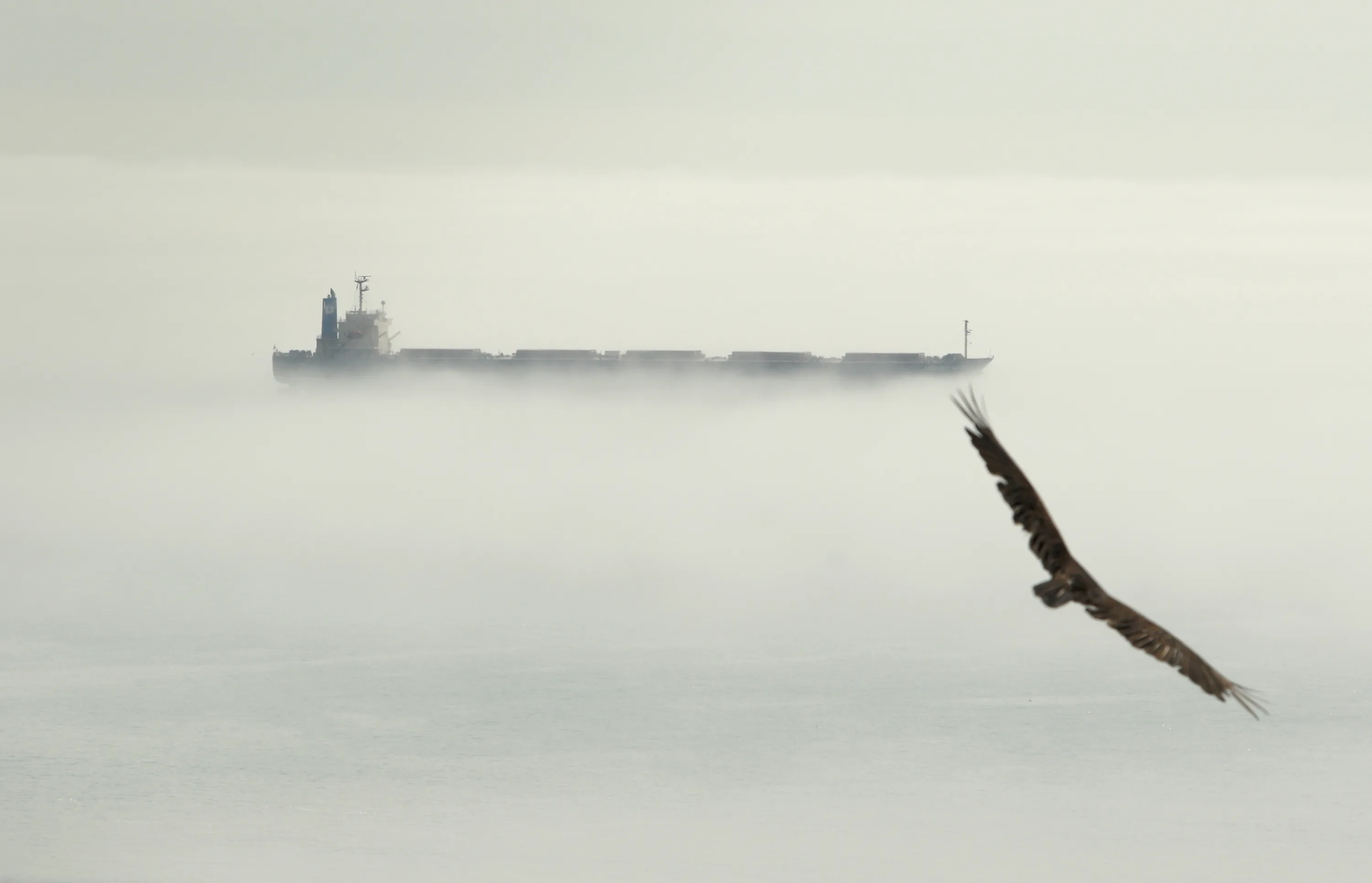 A turkey vulture soars overhead as a freighter navigates the morning fog through Royal Bay in Colwood, British Columbia, Wednesday, May 17, 2023. (Photo by Chad Hipolito/The Canadian Press via AP Photo)