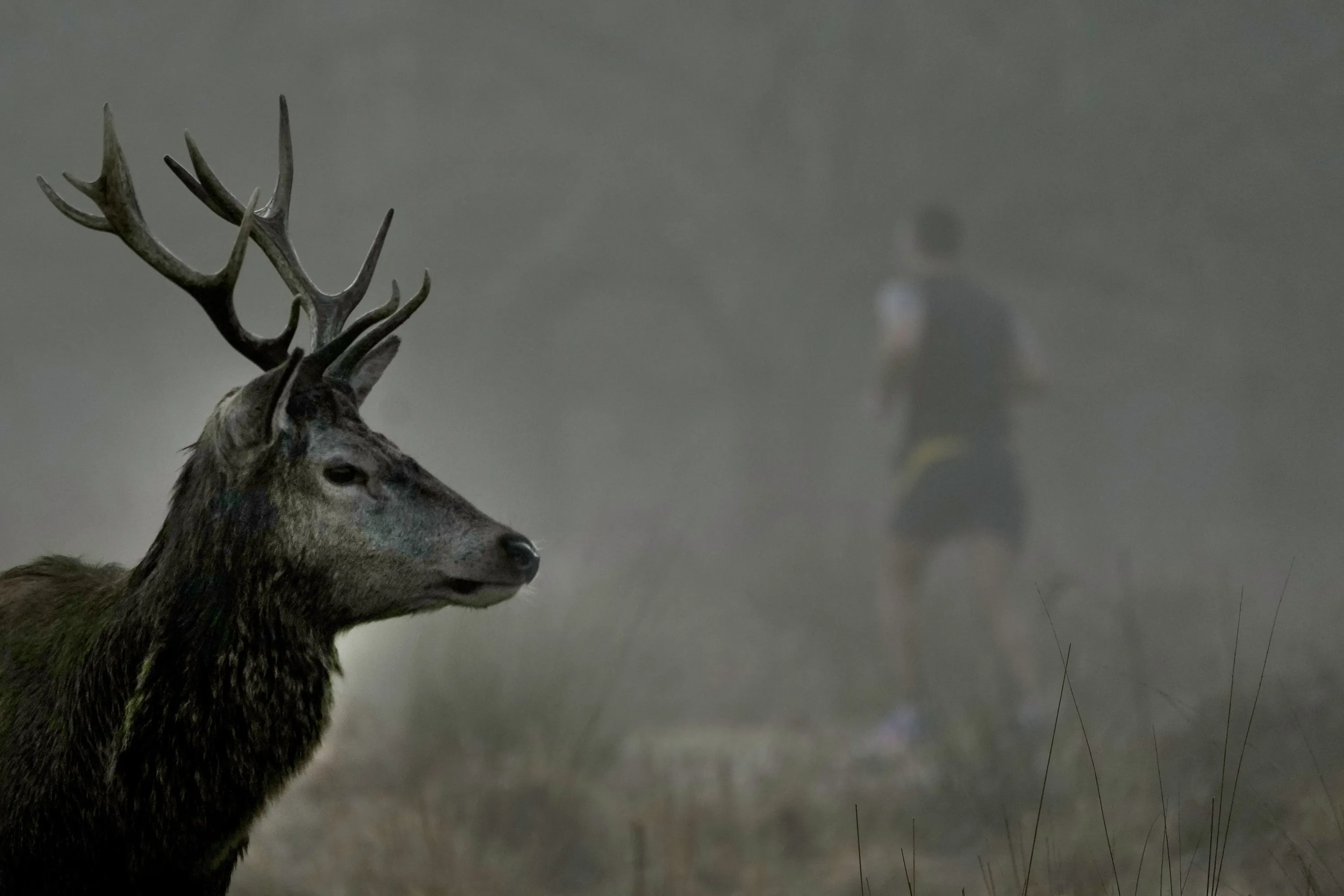Deer watches as a man runs in the morning mist at Richmond Park in London, Wednesday, February 15, 2023. (Photo by Frank Augstein/AP Photo)