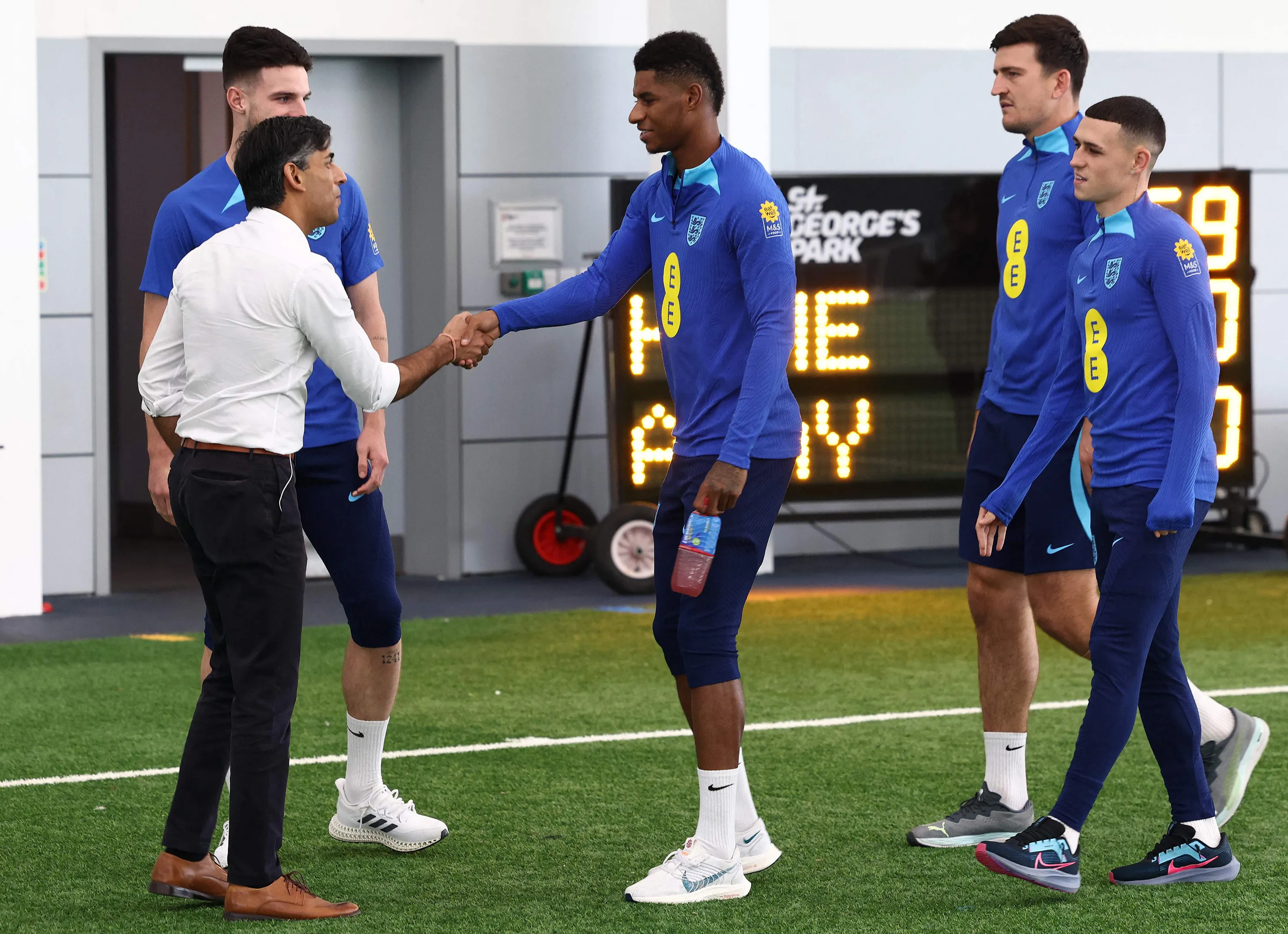 Britain's Prime Minister Rishi Sunak (2L) meets England's striker Marcus Rashford (C), England's midfielder Declan Rice (L), England's defender Harry Maguire (2R) and England's midfielder Phil Foden during an England training session at St George's Park in Burton-on-Trent, central England, on October 10, 2023. Seven years after awarding Euro-2024 to Germany, UEFA announced on October 10, 2023 the hosts for the next two editions: The United Kingdom and Ireland are due to host the tournament together in 2028, followed by the unprecedented tandem of Italy and Turkey in 2032. (Photo by Darren Staples/Pool via AFP Photo)